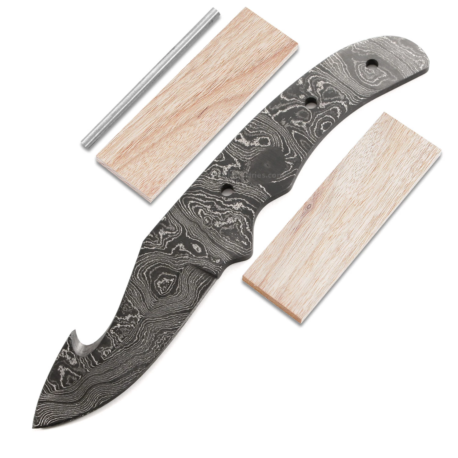 This gut hook knife blank design is called the “Ace Gut Hook”. It is a USA Made carbon steel damascus fixed blade kit that is hollow-ground and ready to build. This model will make a fantastic personal damascus skinning knife with the gut hook design. It will also serve very well as a collectible gift project. The Ace Gut Hook knife kit has a blade length of 3.25 inches and an overall length of 8.00 inches. Ground on both sides, the blade is 1.25 inches wide. This gut hook knife kit design features (3) .187 inches through holes for handle construction (stainless steel – included). This version is the combo kit. It comes with the Ace Guthook blade blank, handle pinstock, plus Canarywood handle scales to simplify the completion process. The Ace Gut Hook tang holes can be modified with ease to work with larger pinstock or threaded fasteners, if desired. Please see our drills and taps sections for more options.
