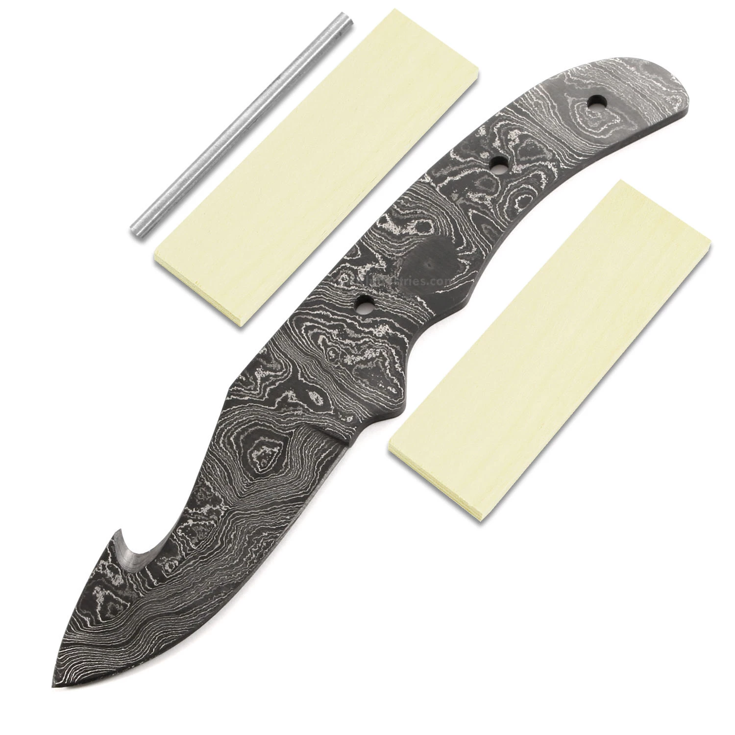 This gut hook knife blank design is called the “Ace Gut Hook”. It is a USA Made carbon steel damascus fixed blade kit that is hollow-ground and ready to build. This model will make a fantastic personal damascus skinning knife with the gut hook design. It will also serve very well as a collectible gift project. The Ace Gut Hook knife kit has a blade length of 3.25 inches and an overall length of 8.00 inches. Ground on both sides, the blade is 1.25 inches wide. This gut hook knife kit design features (3) .187 inches through holes for handle construction (stainless steel – included). This version is the combo kit. It comes with the Ace Guthook blade blank, handle pinstock, plus Yellowheart handle scales to simplify the completion process. The Ace Gut Hook tang holes can be modified with ease to work with larger pinstock or threaded fasteners, if desired. Please see our drills and taps sections for more options.