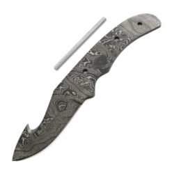 This gut hook knife blank design is called the “Ace Gut Hook”. It is a USA Made carbon steel damascus fixed blade kit that is hollow-ground and ready to build. This model will make a fantastic personal damascus skinning knife with the gut hook design. It will also serve very well as a collectible gift project.