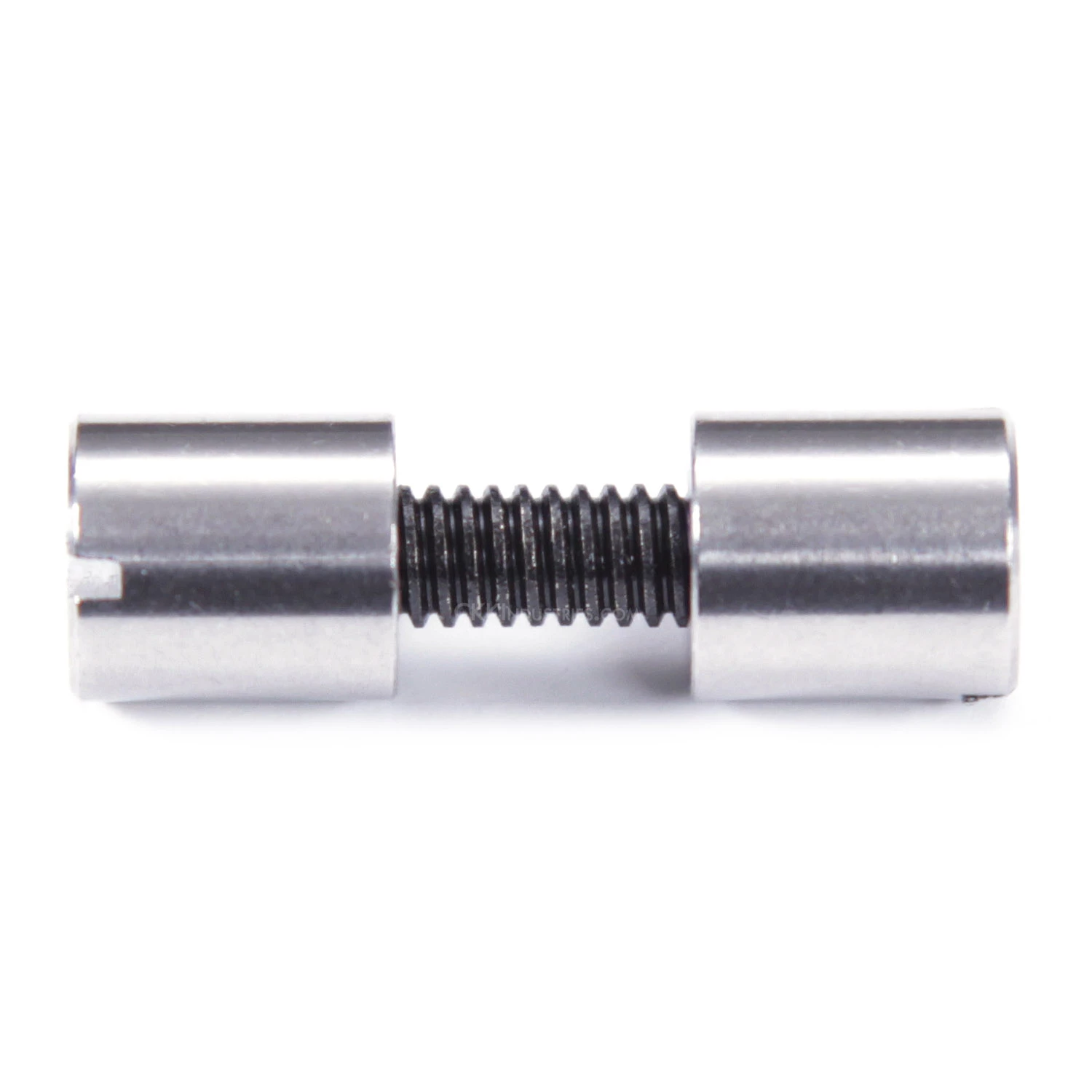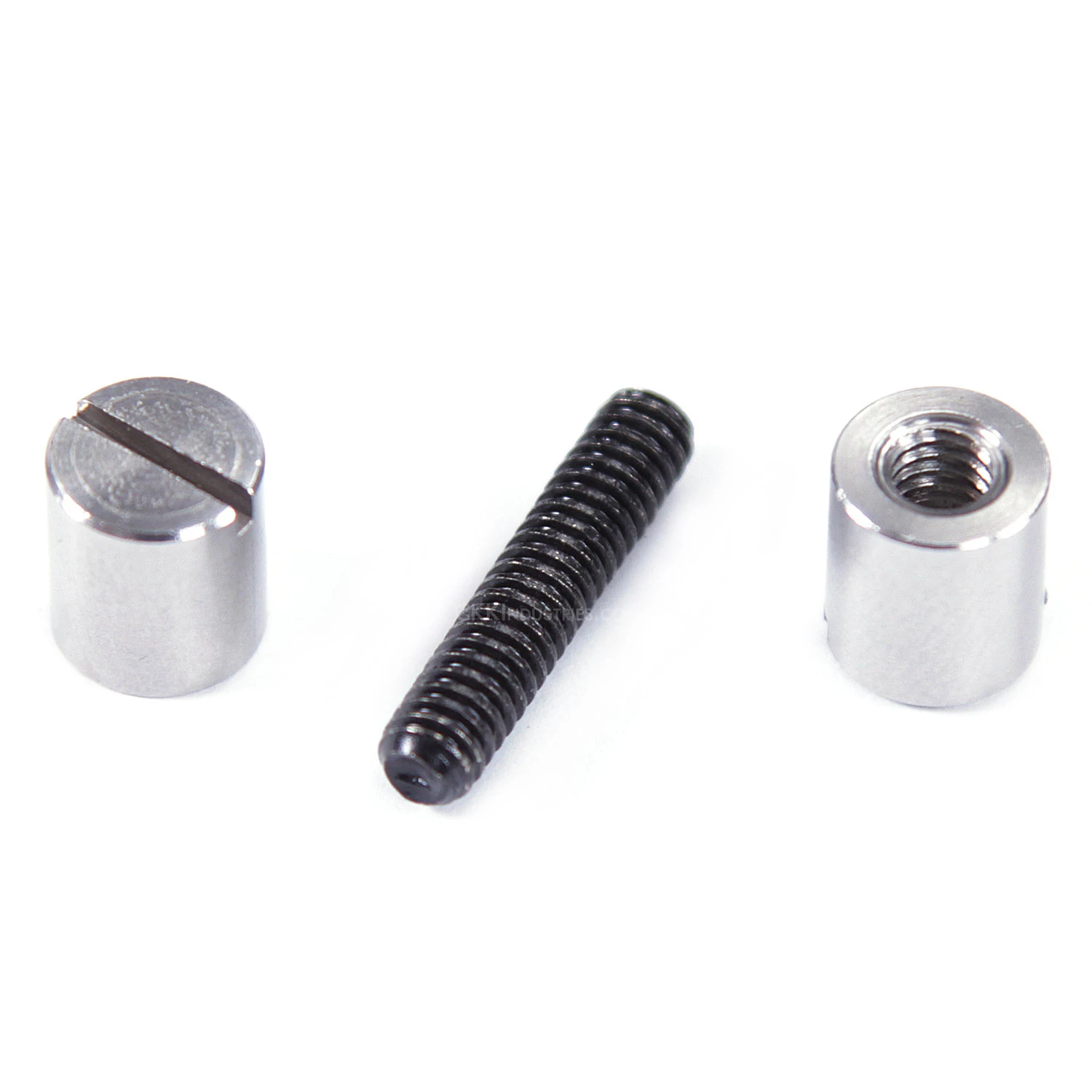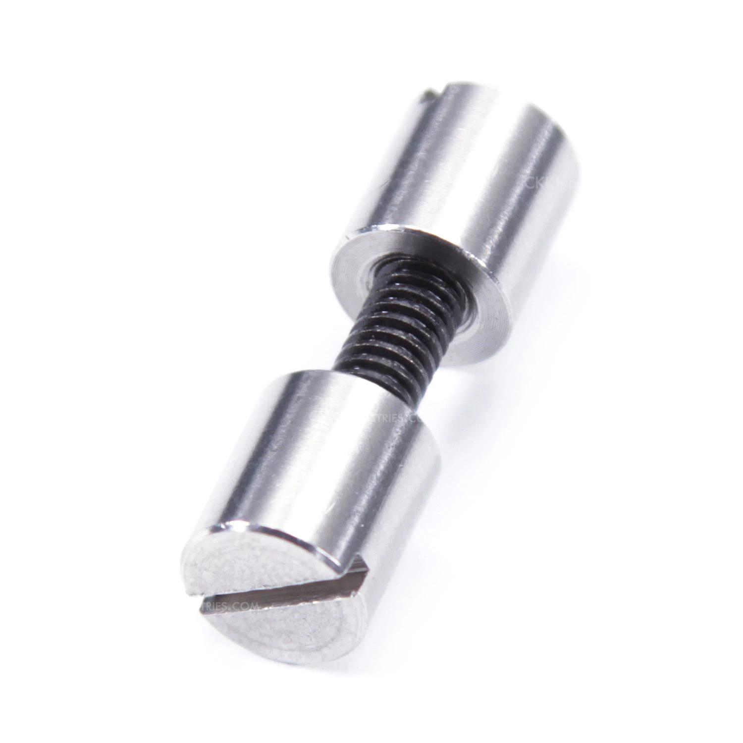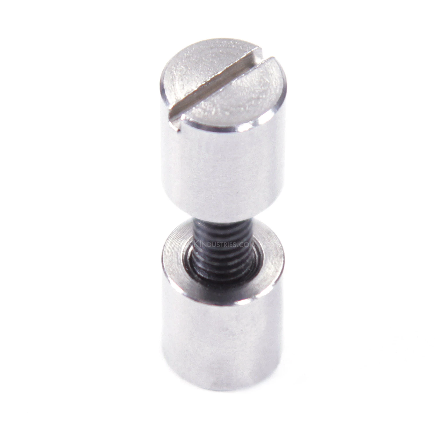 Acorn Nut Screws are also referred to as “Luke Rivets” for knife handles. Acorn Nut Screws are 3-piece threaded fasteners that work extremely well for knife handle attachment. With this design, you will create a step hole in your handle material that is slightly larger than the shank of the threaded rod. The three-part assembly allows for you to pass the threaded rod precisely through your knife tang hole and handle material, allowing the larger radius of the heads to create a pinch points on both sides of the handle material, where it can then be tightened down to a secure hold. Once the threaded heads have been tightened, they can be sanded to a flush finish with the handle surface. This will result in a smooth, pin-like visual effect on the final knife handle. When used with epoxy and/or thread-locker adhesive, they will create a permanent handle bond.