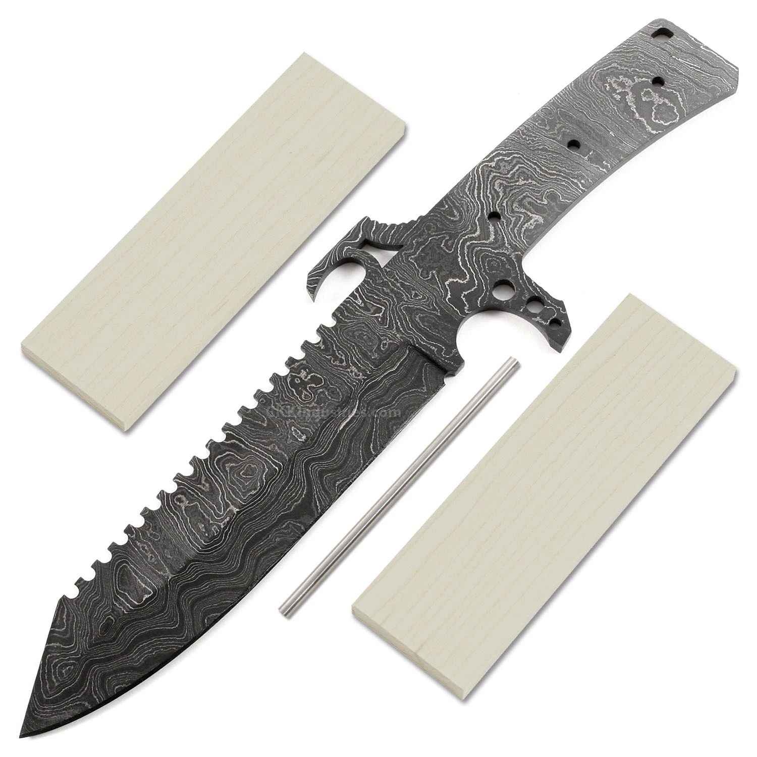 This full tang knife blank design is called the Alien Hunter knife kit. It is a USA Made carbon steel damascus fixed blade knife kit that is hollow-ground and ready to build. This model is a really cool design and will make a fantastic damascus knife. It has lots of potential for handle work and finish customization. The Alien Hunter knife kit has a blade length of 5-5/8 inches and an overall length of 10-3/4 inches. Ground on both sides, the blade is 1-1/2″ wide. This damascus knife blank design features (3) .125″ through-holes for handle construction (pinstock included – stainless steel). The Alien Hunter’s tang holes can be modified with ease to work with larger pinstock, or with threaded fasteners. Please see our drills and taps sections for more options. This version is the combo kit. It comes with the Alien Hunter blade blank, handle pinstock, plus Curly Maple handle scales to simplify the completion process.