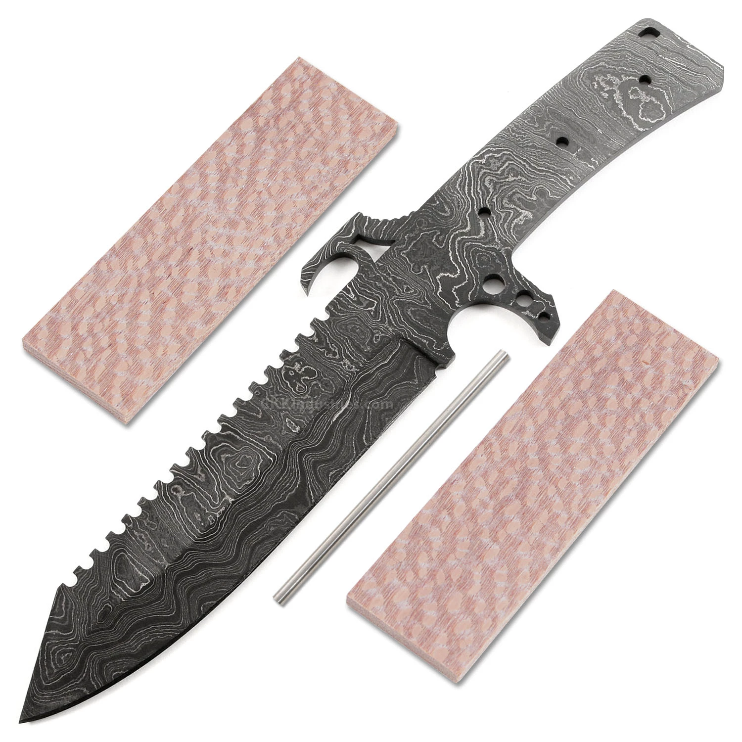 This full tang knife blank design is called the Alien Hunter knife kit. It is a USA Made carbon steel damascus fixed blade knife kit that is hollow-ground and ready to build. This model is a really cool design and will make a fantastic damascus knife. It has lots of potential for handle work and finish customization. The Alien Hunter knife kit has a blade length of 5-5/8 inches and an overall length of 10-3/4 inches. Ground on both sides, the blade is 1-1/2″ wide. This damascus knife blank design features (3) .125″ through-holes for handle construction (pinstock included – stainless steel). The Alien Hunter’s tang holes can be modified with ease to work with larger pinstock, or with threaded fasteners. Please see our drills and taps sections for more options. This version is the combo kit. It comes with the Alien Hunter blade blank, handle pinstock, plus Lacewood handle scales to simplify the completion process.