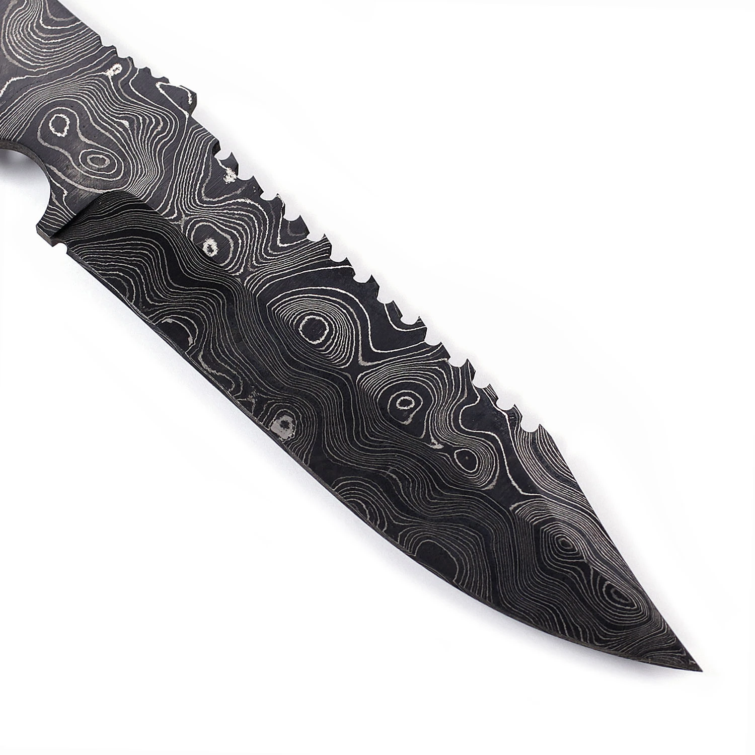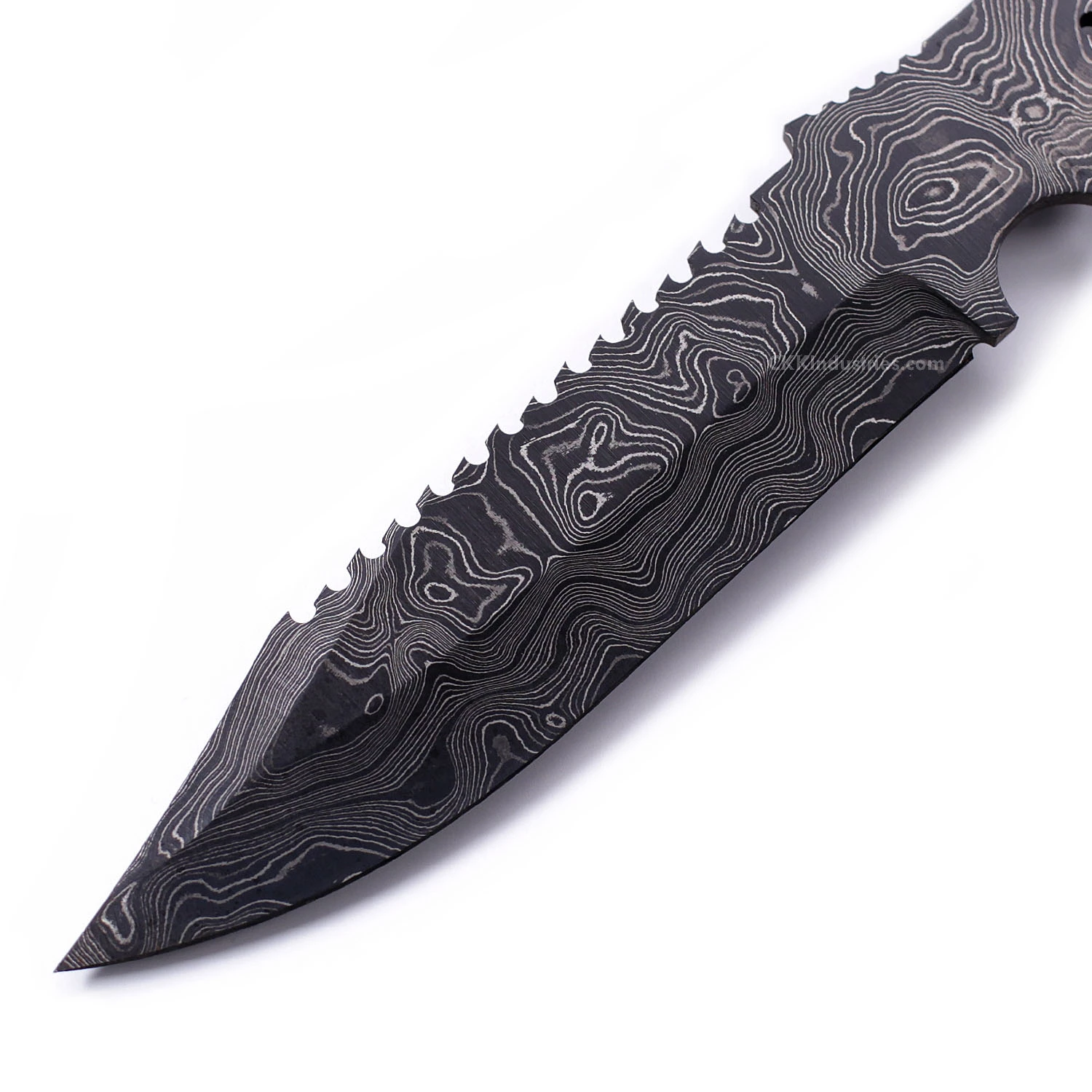 This full tang knife blank design is called the Alien Hunter knife kit. It is a USA Made carbon steel damascus fixed blade knife kit that is hollow-ground and ready to build. This model is a really cool design and will make a fantastic damascus knife. It has lots of potential for handle work and finish customization. The Alien Hunter knife kit has a blade length of 5-5/8 inches and an overall length of 10-3/4 inches. Ground on both sides, the blade is 1-1/2″ wide. This damascus knife blank design features (3) .125″ through-holes for handle construction (pinstock included – stainless steel). The Alien Hunter’s tang holes can be modified with ease to work with larger pinstock, or with threaded fasteners. Please see our drills and taps sections for more options. This version is the combo kit. It comes with the Alien Hunter blade blank, handle pinstock, plus Mahogany handle scales to simplify the completion process.