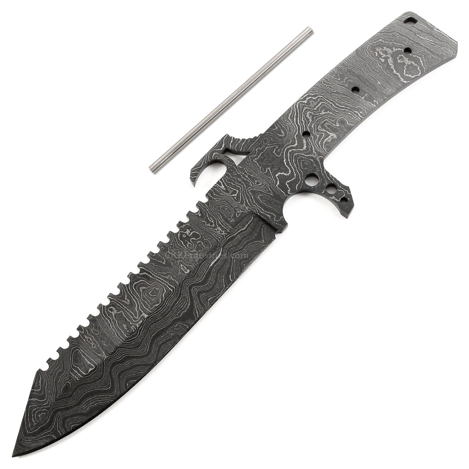 This full tang knife blank design is called the Alien Hunter knife kit. It is a USA Made carbon steel damascus fixed blade knife kit that is hollow-ground and ready to build. This model is a really cool design and will make a fantastic damascus knife. It has lots of potential for handle work and finish customization.
