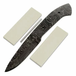This beautiful carry-sized damascus hunting knife kit is called the “Apache”. It is a USA Made carbon steel damascus fixed blade kit that is hollow-ground and ready to build. This damascus knife blank design will make a fantastic personal hunting knife. This hunting knife kit represents the very best in knife making supplies. With a blade length of 3.50 inches, and an overall length of 8.0 inches, this design is a perfect for utility hunting chores. Ground on both sides, the Apache’s blade is 1.00 inches wide. This hunting knife design features (2) 0.156 inch through-holes for handle construction (stainless steel pinstock included). The Apache knife kit tang holes can be modified with ease to work with larger pinstock, or with threaded fasteners. Please see our drills and taps sections for more options.