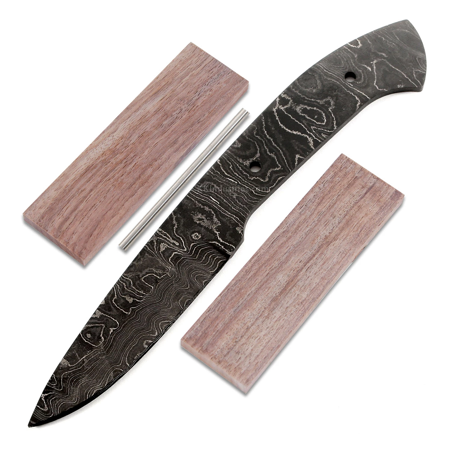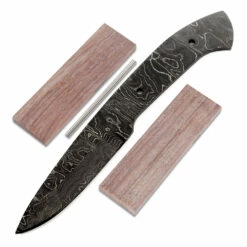 This beautiful carry-sized damascus hunting knife kit is called the “Apache”. It is a USA Made carbon steel damascus fixed blade kit that is hollow-ground and ready to build. This damascus knife blank design will make a fantastic personal hunting knife. This hunting knife kit represents the very best in knife making supplies. With a blade length of 3.50 inches, and an overall length of 8.0 inches, this design is a perfect for utility hunting chores. Ground on both sides, the Apache’s blade is 1.00 inches wide. This hunting knife design features (2) 0.156 inch through-holes for handle construction (stainless steel pinstock included). The Apache knife kit tang holes can be modified with ease to work with larger pinstock, or with threaded fasteners. Please see our drills and taps sections for more options.