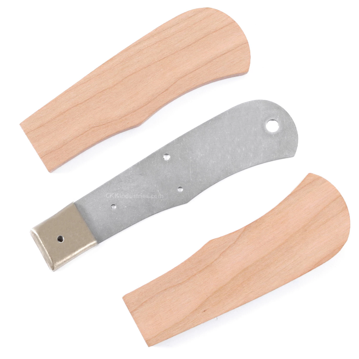 This version is the combo kit. It comes with all knife assembly parts, including pins, springs, thong hole tubing, pre-machined Cherry knife handle scales and a gift box. Add a touch of proper finishing and you will create a fabulous slip joint folding knife that you’ll be proud to carry and own for years.
