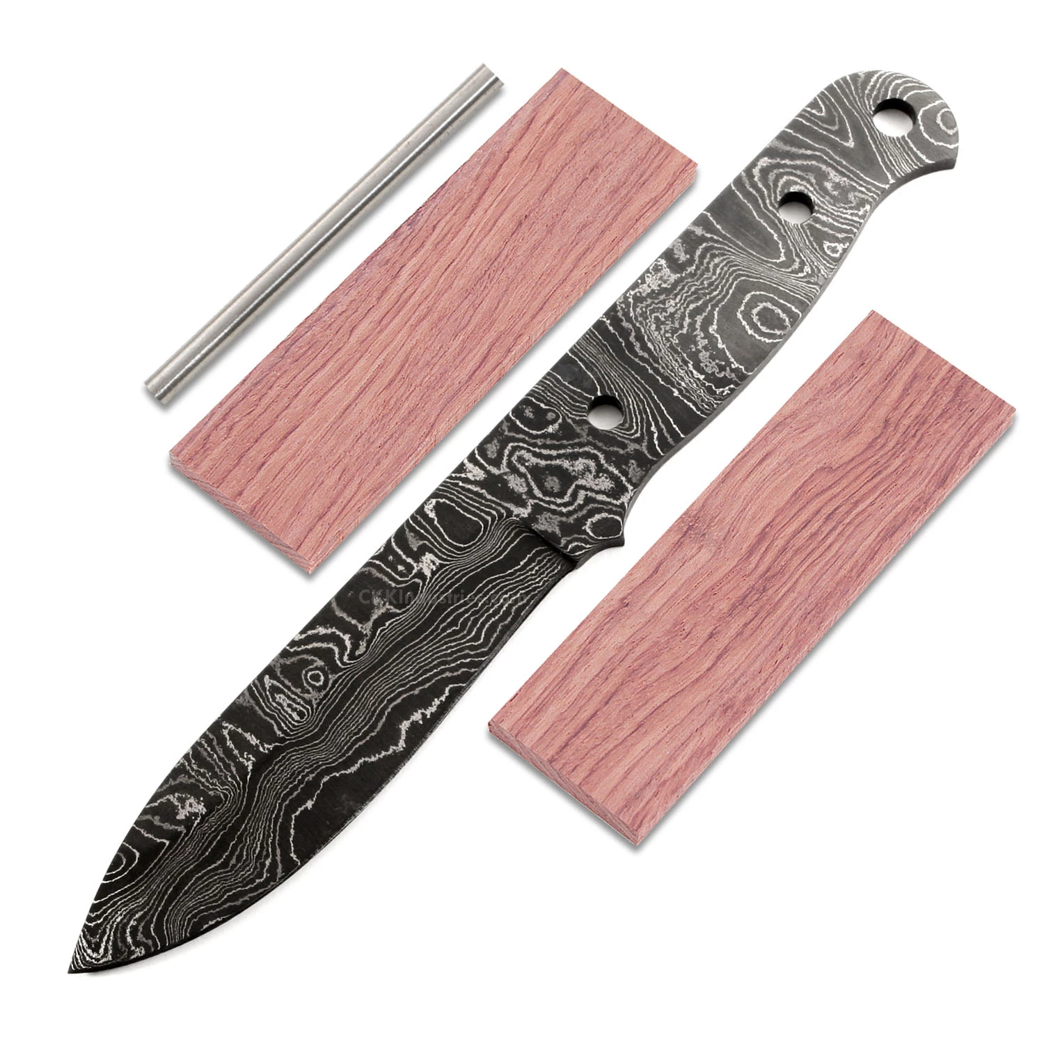 This damascus knife blank model is called the “Big Sky”. It is a USA Made carbon steel damascus fixed blade kit that is hollow-ground and ready to build. This damascus knife making kit will make a fantastic personal hunting or skinning knife. The flow of this hunting knife kit design is excellent, creating a great feel in the hand. With a blade length of 4.00 inches and an overall length of 8.70 inches, this damascus knife kit is a perfect sheath size. Ground on both sides, the Big Sky’s blade is 1.125 inches wide. This damascus blade blank features (2) .250 inch through-holes and (1) .310 inch thong hole for handle construction. The tang holes can be modified with ease to work with larger pinstock, or with threaded fasteners. This kit blade includes stainless steel pinstock, but thong hole tubing is not included. This version is the combo kit. It comes with the Boot Fang blade blank, handle pinstock, plus Bubinga handle scales to simplify the completion process.