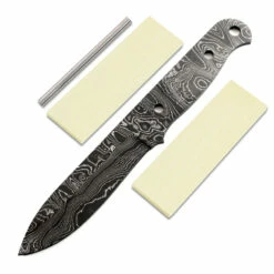 This damascus knife blank model is called the “Big Sky”. It is a USA Made carbon steel damascus fixed blade kit that is hollow-ground and ready to build. This damascus knife making kit will make a fantastic personal hunting or skinning knife. The flow of this hunting knife kit design is excellent, creating a great feel in the hand. With a blade length of 4.00 inches and an overall length of 8.70 inches, this damascus knife kit is a perfect sheath size. Ground on both sides, the Big Sky’s blade is 1.125 inches wide. This damascus blade blank features (2) .250 inch through-holes and (1) .310 inch thong hole for handle construction. The tang holes can be modified with ease to work with larger pinstock, or with threaded fasteners. This kit blade includes stainless steel pinstock, but thong hole tubing is not included. This version is the combo kit. It comes with the Boot Fang blade blank, handle pinstock, plus Yellowheart handle scales to simplify the completion process.
