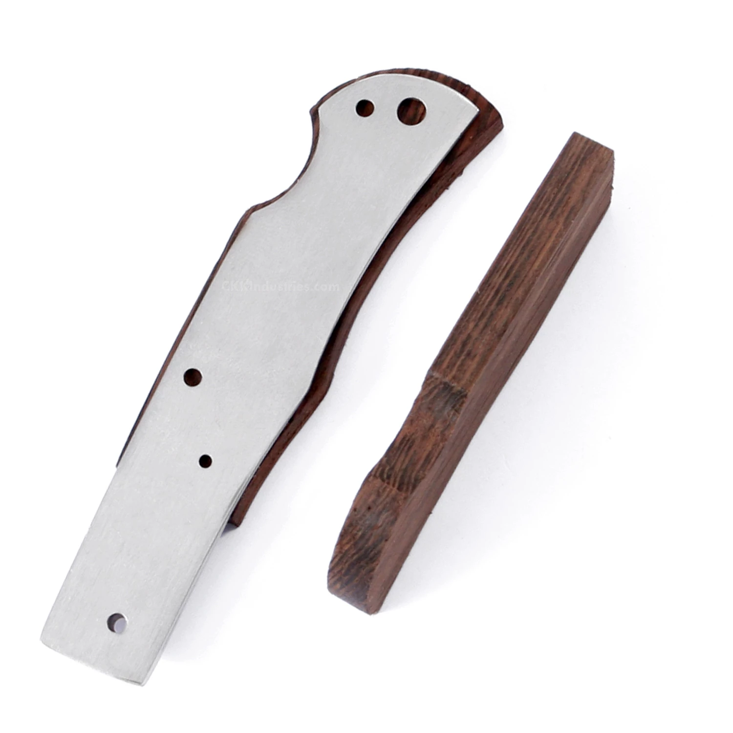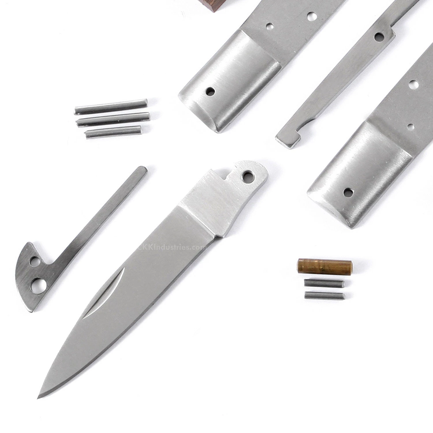Our pre-machined knife handle scales are slightly thicker and larger in diameter than the handle liners that they are designed for. This allows for proper sanding, shaping and artistic embellishment. These are also undrilled to allow for precise placement control and to maximize fastening options. If you do not have a scroll saw to use for creating the required knife handle shape, or you just want to begin from an easier starting point, the combo kit with pre-machined knife handle scales will help you insure that your folding knife kit completion will be smooth and successful. Properly built, this folding lockback knife kit will produce a fantastic pocket knife for everyday use. It has fast lines and excellent lockup and action.
