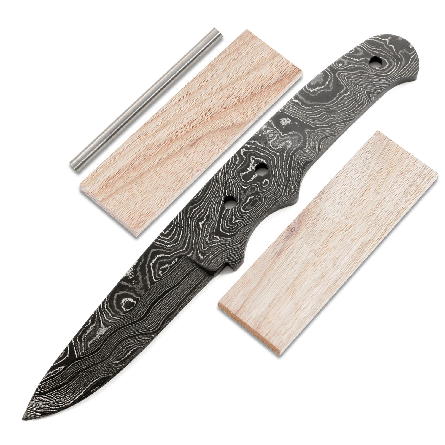 This damascus knife blank model is called the “Bodyguard”. It is a USA Made carbon steel damascus fixed blade kit that is hollow-ground and ready to build. This damascus knife making kit is a great size for a personal everyday carry knife. Based on the simplicity of the knife kit build, it would also serve very well as a collectible gift project. With a blade length of 2-11/16 inches and an overall length of 7 inches, this damascus blade blank design is very popular for self defense. Ground on both sides, the Bodyguard’s blade is 7/8 inches wide with a .140 inch thickness. This damascus knife kit features (3) .156 inch through-holes for handle construction (pinstock included – stainless steel). The tang holes can be modified with ease to work with larger pinstock, or with threaded fasteners. This version is the combo kit. It comes with the Boot Fang blade blank, handle pinstock, plus Canarywood handle scales to simplify the completion process.