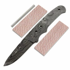 This damascus knife blank model is called the “Bodyguard”. It is a USA Made carbon steel damascus fixed blade kit that is hollow-ground and ready to build. This damascus knife making kit is a great size for a personal everyday carry knife. Based on the simplicity of the knife kit build, it would also serve very well as a collectible gift project. With a blade length of 2-11/16 inches and an overall length of 7 inches, this damascus blade blank design is very popular for self defense. Ground on both sides, the Bodyguard’s blade is 7/8 inches wide with a .140 inch thickness. This damascus knife kit features (3) .156 inch through-holes for handle construction (pinstock included – stainless steel). The tang holes can be modified with ease to work with larger pinstock, or with threaded fasteners. This version is the combo kit. It comes with the Boot Fang blade blank, handle pinstock, plus Lacewood handle scales to simplify the completion process.