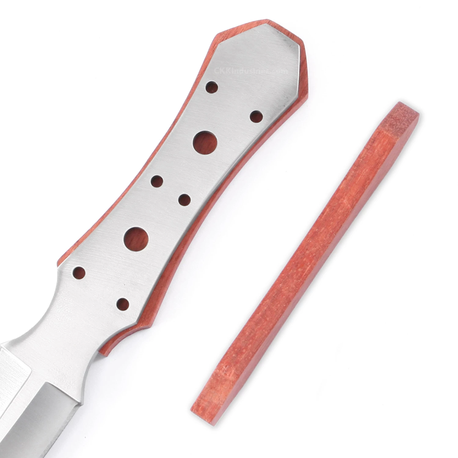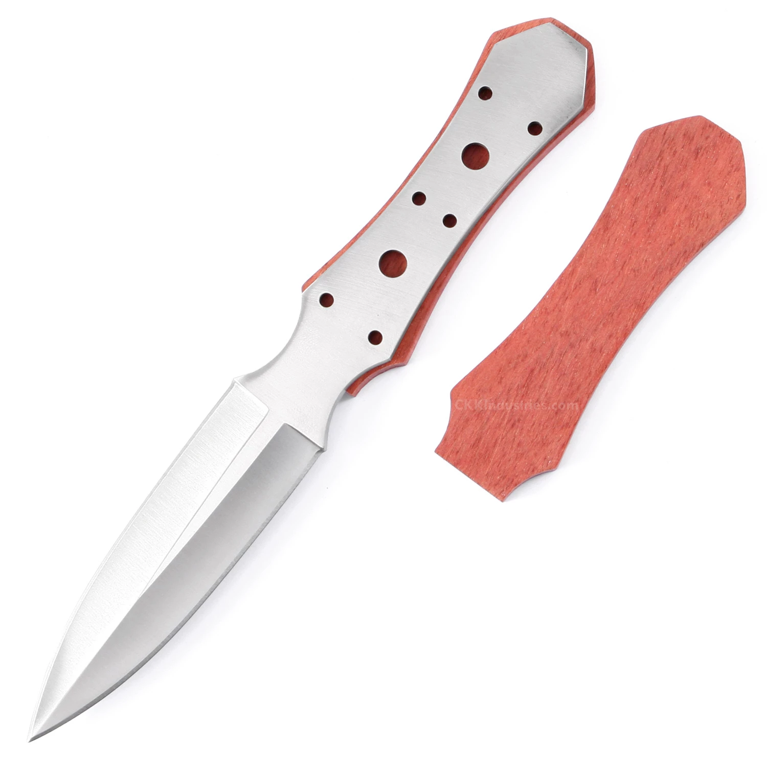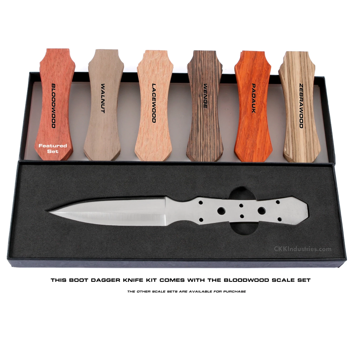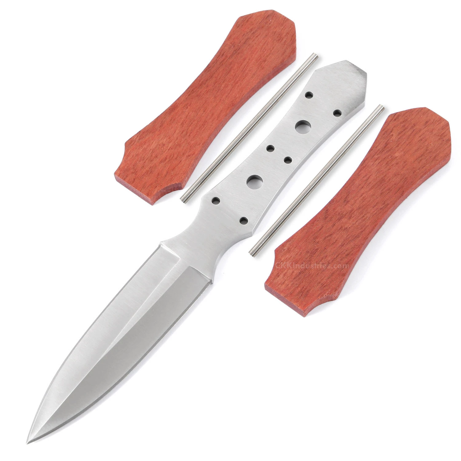 This classic boot dagger knife kit design is known as the “Gambler’s Best Friend”. It has been used throughout history and were often prized by members of the nobility class. Our Boot Dagger kit knife features the classic dagger look with a double hollow-ground blade and has pre-drilled holes on the tang to accommodate handle construction. This boot dagger knife blank design makes an excellent concealed-carry knife. This kit is the combo kit and comes with pre-machined Bloodwood knife handle scales and pinstock. Whether you make this knife kit as an art piece, or build it for everyday carry, the Boot Dagger knife kit makes for a fun project and a great knife making experience. This dagger knife design features (6) .125 inch tang holes, and includes stainless steel pinstock for basic handle construction. The two additional center tang holes are .240 inches in diameter and are for weight reduction.