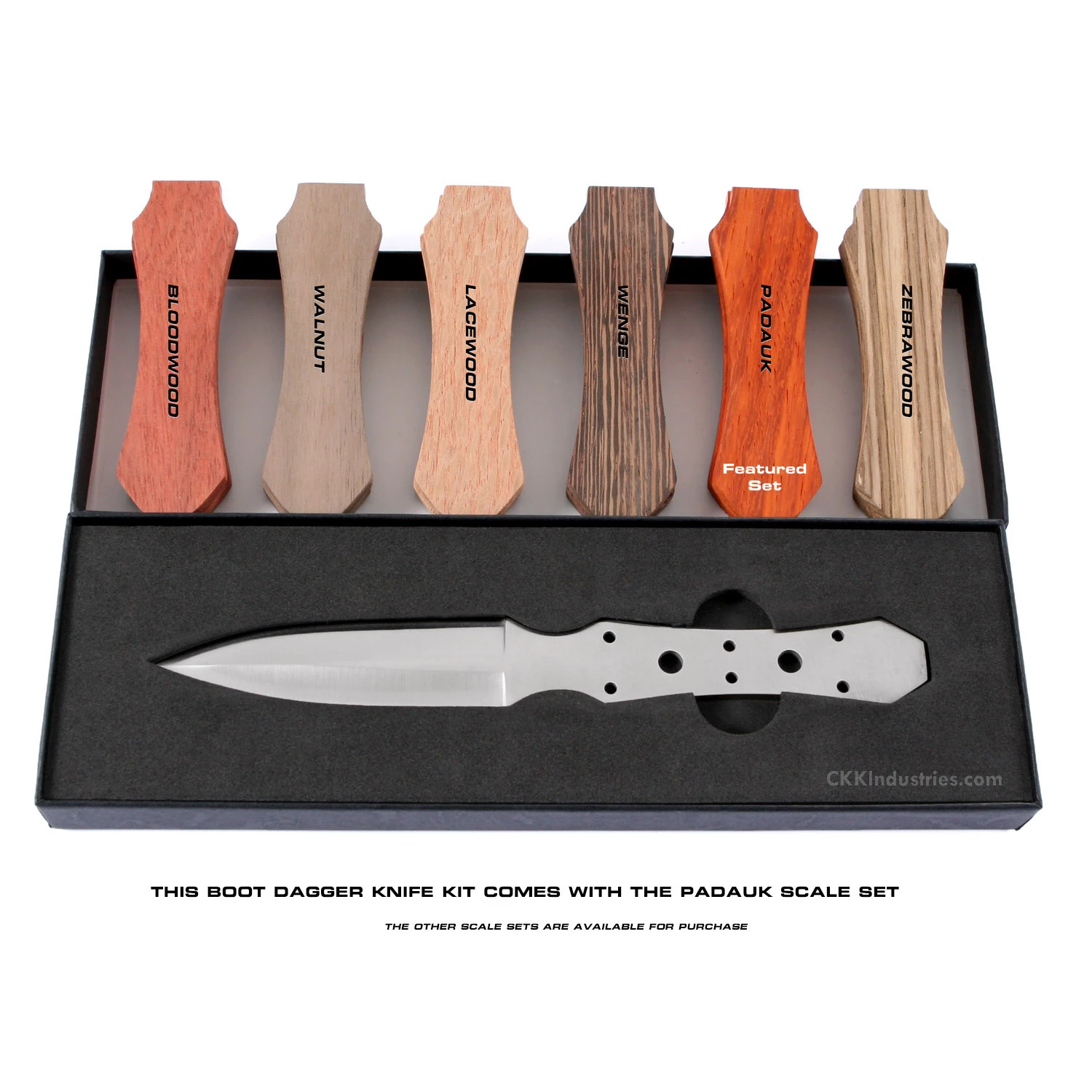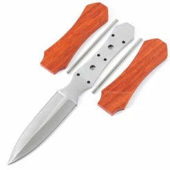 This boot dagger knife blank design makes an excellent concealed-carry knife. This kit is the combo kit and comes with pre-machined Padauk knife handle scales and pinstock. Whether you make this knife kit as an art piece, or build it for everyday carry, the Boot Dagger knife kit makes for a fun project and a great knife making experience. This dagger knife design features (6) .125 inch tang holes, and includes stainless steel pinstock for basic handle construction. The two additional center tang holes are .240 inches in diameter and are for weight reduction.