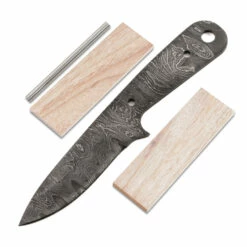 This damascus knife making kit is called the “Boot Fang”. It is a USA Made carbon steel damascus fixed blade blank that is hollow-ground and ready to build. This damascus knife kit model is small enough to “hide away”, and will make a fantastic personal everyday carry knife. It will also serve very well as a collectible gift project. The Boot Fang knife kit has a blade length of 2-1/2 inches and an overall length of 5-5/16 inches. Ground on both sides, the blade is 3/4″ wide. This damascus knife blank design features (2) .125″ through holes for handle construction (pinstock included – stainless steel) with a .250″ thong hole for an optional lanyard (thong hole tubing not included). The tang holes can be modified with ease to work with larger pinstock, or with threaded fasteners. This version is the combo kit. It comes with the Boot Fang blade blank, handle pinstock, plus Canarywood handle scales to simplify the completion process.