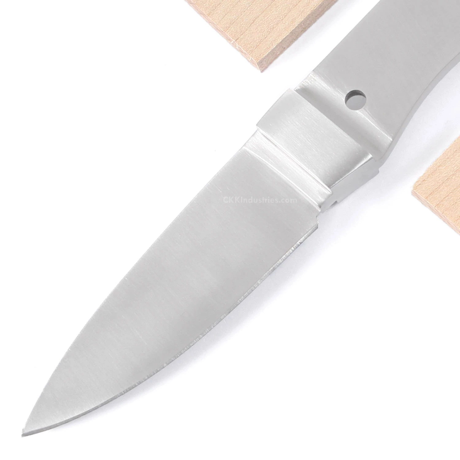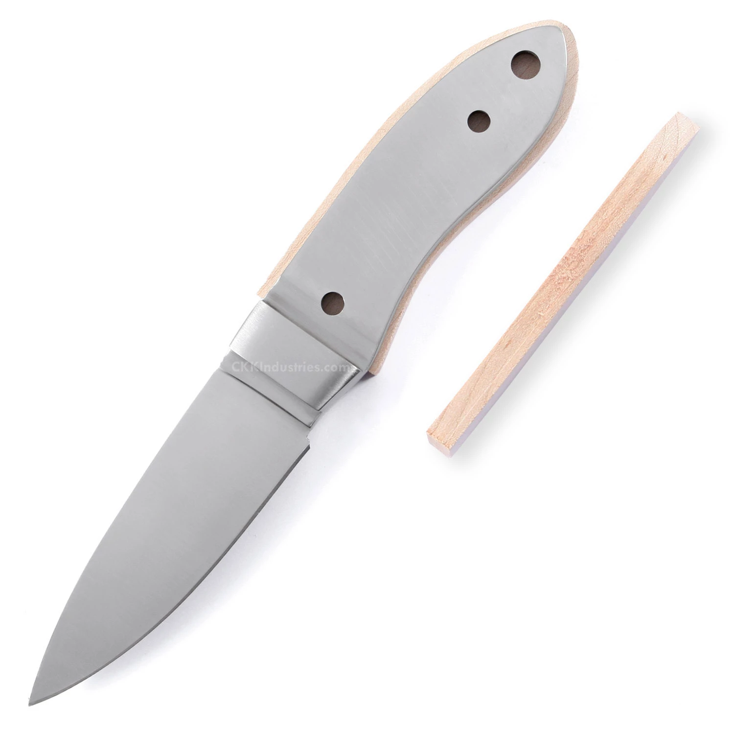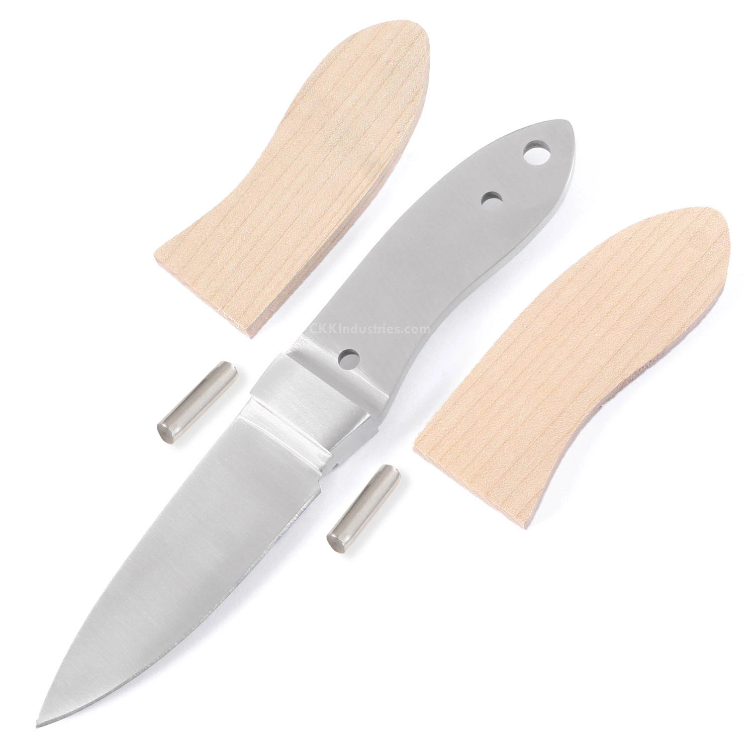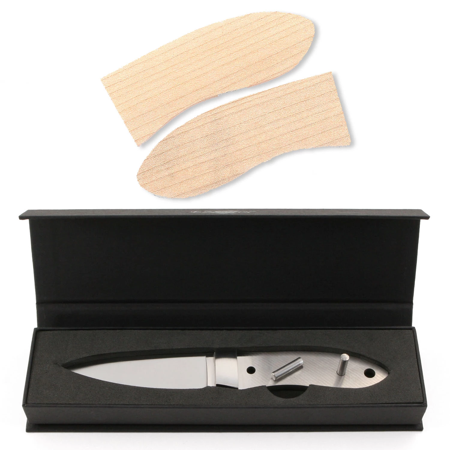 The Boot Shark fixed blade knife kit is a modern “boot knife inspired” combination design. It will work well as a skinning knife, with an upscale handle, or as a classic boot knife, with a tactical handle treatment. The Boot Shark knife is 7.50 inches in overall length with a 2.625 inch blade. The blade thickness is .175 inches. This skinning boot knife kit design feels great in the hand. The dual stainless bolsters are already pre-attached, helping to simplify the building process. The blade on the Boot Shark is made from AUS8 stainless steel and is flat-ground. This knife kit design features (2) .200 inch handle holes for handle attachment (stainless steel pins included) and (1) .250 inch thong hole for optional placement (thong hole tubing not included). This version is the combo kit. It comes with the Boot Shark blade plus pre-machined Curly Maple handle scales and stainless steel pinstock to simplify the completion process. This is a great project blade for a weekend knife making session. Spend some time with this knife kit and enjoy the fun of knife making and customization.