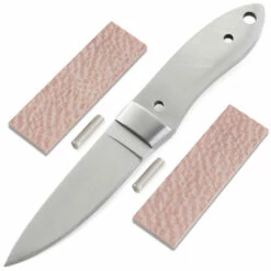 The blade on the Boot Shark is made from AUS8 stainless steel and is flat-ground. This knife kit design features (2) .200 inch handle holes for handle attachment (stainless steel pins included) and (1) .250 inch thong hole for optional placement (thong hole tubing not included).