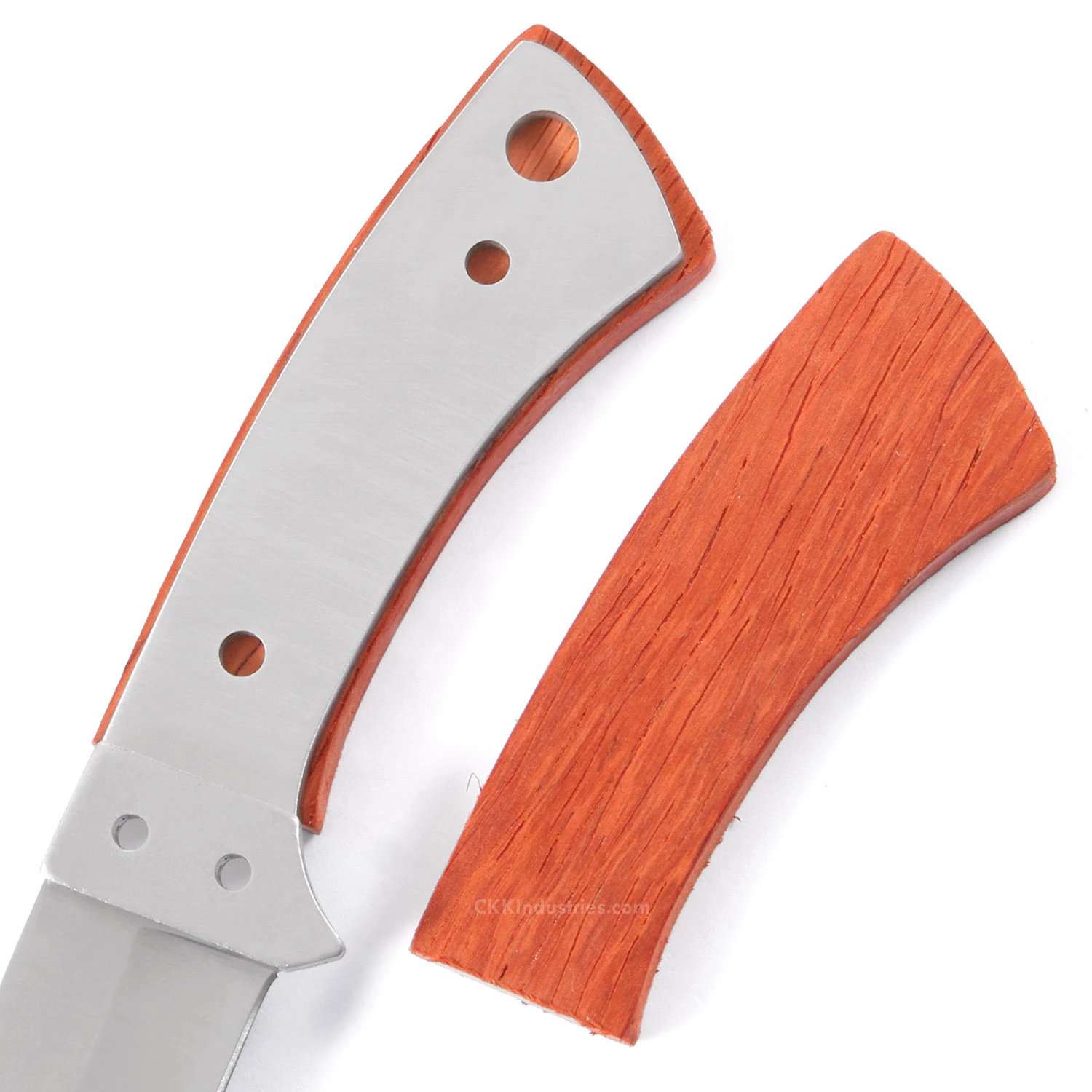 These are pre-machined Padauk handle scales for our Boot Skinner knife kit. Pre-machined knife handle scales will greatly simplify the process of roughing-in the complex handle shape for this design. Padauk is a very popular wood amongst woodworkers due to its unique coloration and durability. Coloration can vary from a pale orange to a deep brownish red and can darken over time or with exposure to UV light. It’s easily worked and finishes, glues and turns very well. Choose Padauk for your next project to make something truly unique.