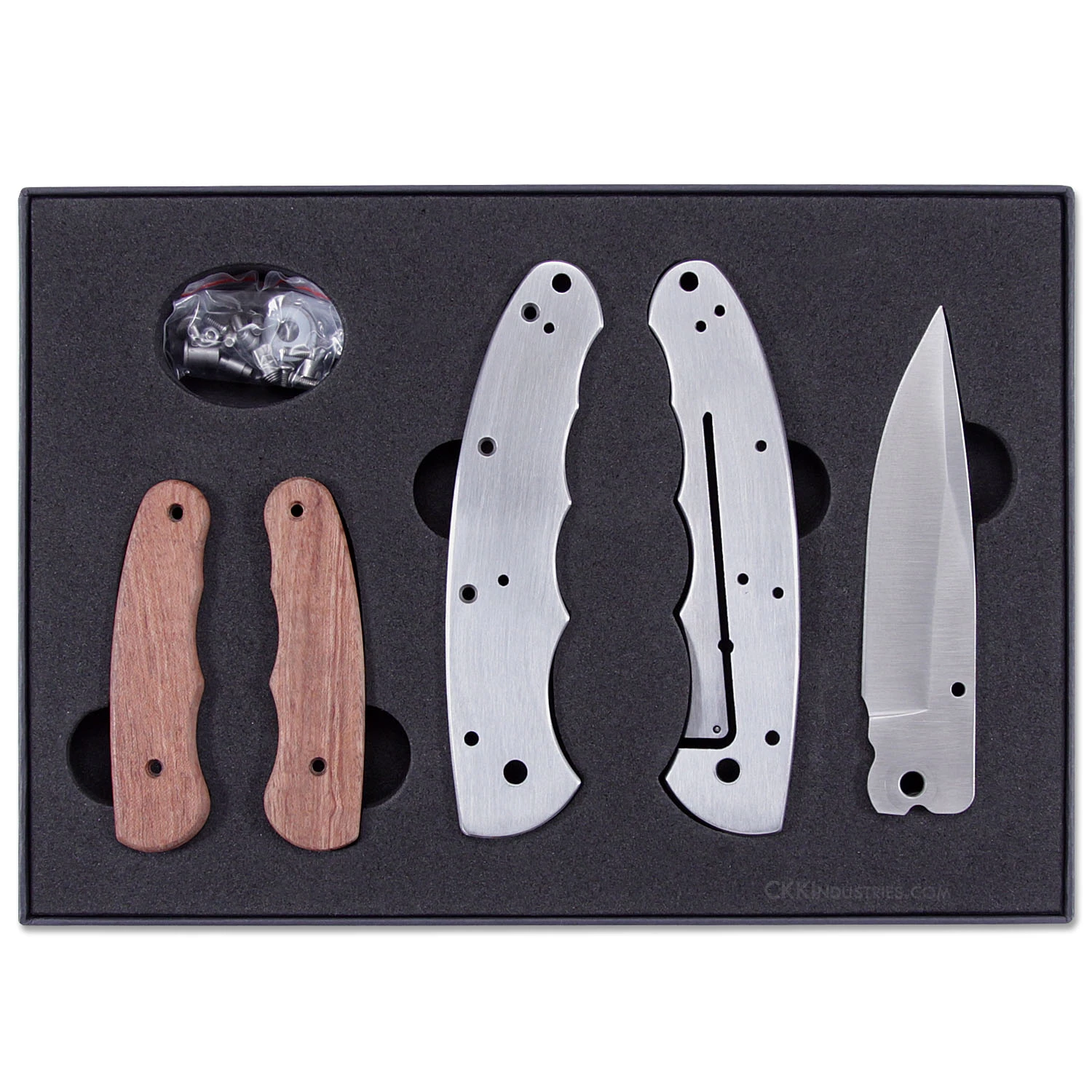 Properly built, one can easily exceed the quality and performance found on many high end production folding knives available today. The modification options on this knife kit model are virtually limitless, as you can add filework, engraving, different handle treatments, and much more. The base unit is designed to be easily assembled and does not require any additional parts for standard completion (see finished standard model photos).