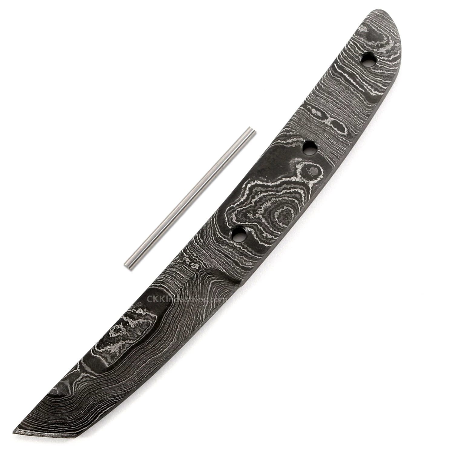 This damascus Japanese tanto knife kit design is called the “Bushido”. It is a USA Made carbon steel damascus fixed blade kit that is hollow-ground and ready to build. This tanto blade blank design is scaled-down for easy use and carry comfort. The Bushido Japanese tanto knife kit has a blade length of 3 inches and an overall length of 7.312 inches. Ground on both sides, the tanto blade is .825 inches wide. This damascus tanto blade blank design features (3) .156 inch through-holes for handle construction (stainless steel pinstock included). The tang holes can be modified with ease to work with larger pinstock, or with threaded fasteners. Please see our drills and taps sections for more options.