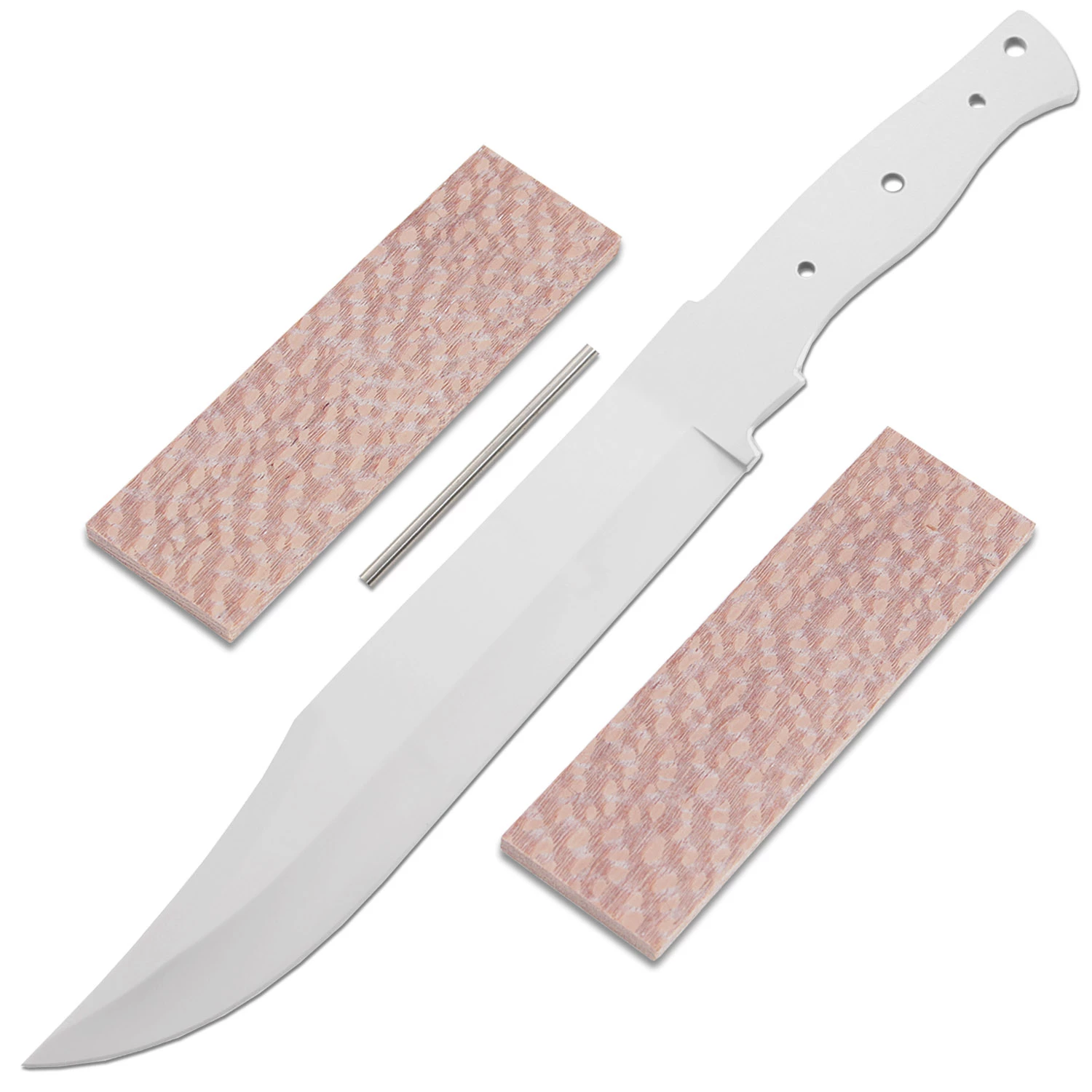 The Camp Master knife kit blade is a great all-around camp knife design, featuring a full tang handle and 9 inches of cutting edge. This bowie blade blank is made from 440C stainless steel and is a full 15.125 inches long. It is 0.190 inches thick and 1.75 inches wide at the widest point, hollow ground and mirror finished.