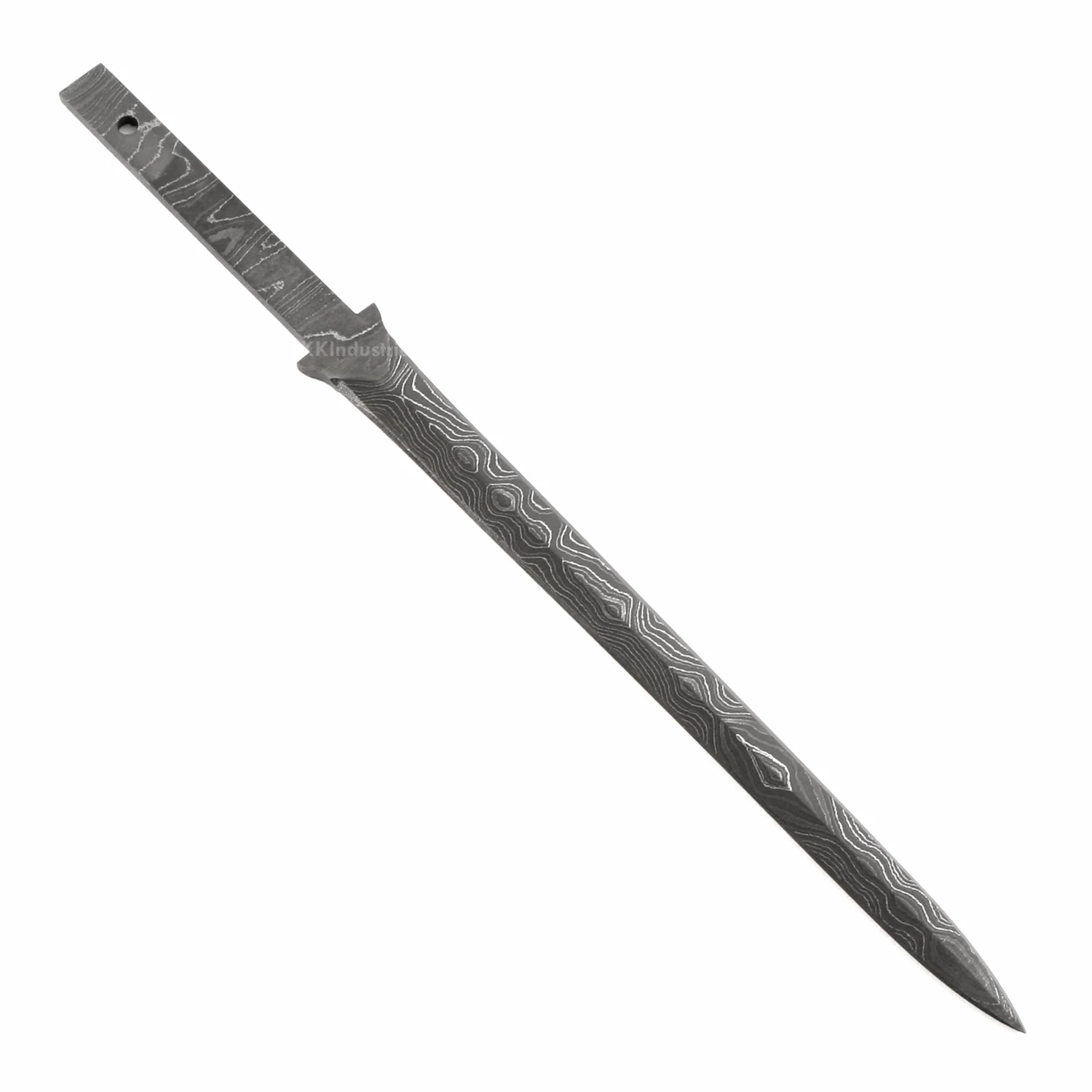 This damascus rapier knife making kit is called the “CEO Rapier”. It is a USA Made carbon steel damascus fixed blade knife blank that is ground and ready to build. This hidden tang knife blank design is great for executive letter opening, or as a hide-away for stylish desk drawer defense. The CEO Rapier hidden tang knife kit has a blade length of 5.50 inches and an overall length of 8.65 inches. Ground on both sides, the CEO Rapier’s blade is 0.50 inches wide. This damascus hidden tang knife blank design features (1) 0.085 inch through-hole for handle construction (stainless steel pinstock included). The tang hole can be modified with ease to work with larger pinstock, or with threaded fasteners.