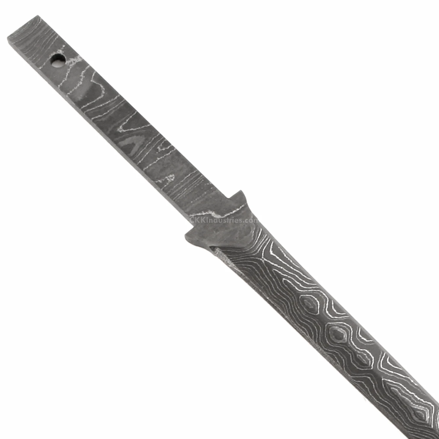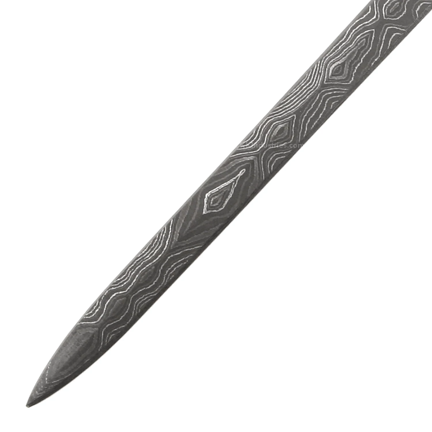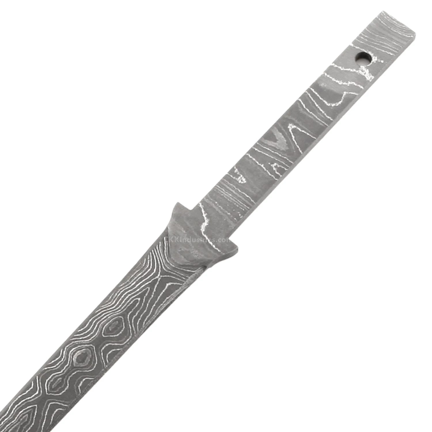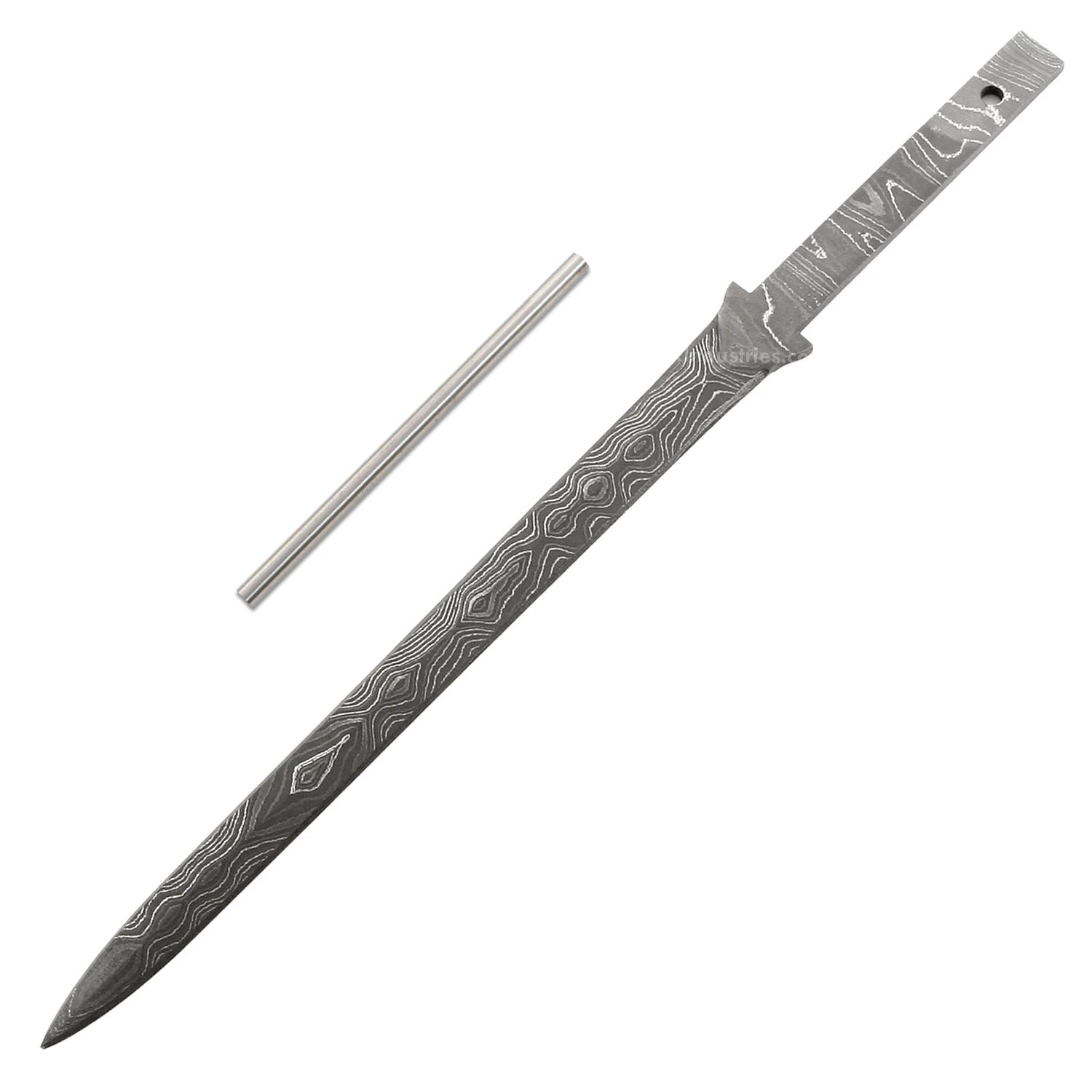 This damascus rapier knife making kit is called the “CEO Rapier”. It is a USA Made carbon steel damascus fixed blade knife blank that is ground and ready to build. This hidden tang knife blank design is great for executive letter opening, or as a hide-away for stylish desk drawer defense. The CEO Rapier hidden tang knife kit has a blade length of 5.50 inches and an overall length of 8.65 inches. Ground on both sides, the CEO Rapier’s blade is 0.50 inches wide. This damascus hidden tang knife blank design features (1) 0.085 inch through-hole for handle construction (stainless steel pinstock included). The tang hole can be modified with ease to work with larger pinstock, or with threaded fasteners.