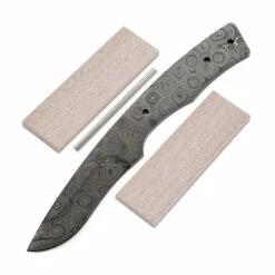 This boot-sized damascus full tang knife kit design is called the “Claw”. It is a USA Made carbon steel damascus fixed blade knife blank that is hollow-ground and ready to build. This damascus knife blank model is small enough to “hide away”, and will make a fantastic personal carry knife. It will also serve very well as a collectible gift project. The Claw has a blade length of 2.50 inches and an overall length of 6.375 inches. Ground on both sides, the blade is .812 inches wide. This damascus full tang knife blank design features (3) .125 inches through holes for handle construction (stainless steel pinstock included). The tang holes can be modified with ease to work with larger pinstock, or with threaded fasteners. Please see our knife making parts section for more options. This version of the Claw is the combo kit. It comes with the Claw blade, Mahogany handle scales, and stainless steel pinstock to simplify the completion process. This is a great project blade for a weekend knife making session. Spend some quality workshop time with this skinning knife kit and enjoy the fun of custom knife making and customization.