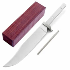 This is a precision bowie knife hidden tang blade and is a fun and simple project to complete. For handle fastening, the tang has (2) pre-drilled 0.156 inch holes in it (stainless steel pinstock included). This version of the Clip Point Bowie is the combo kit. It comes with the Clip Point Bowie Blade, guard, stainless steel pinstock, and a premium block of Katalox handle material to simplify the completion process. This is a great project blade for a weekend knife making session. Spend some quality workshop time with this excellent hidden tang knife kit and enjoy the fun of custom knife making and customization.