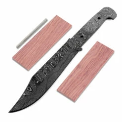 This damascus clip point knife blank model is called the “Clipper”. It is a USA Made carbon steel damascus fixed blade knife blank that is hollow-ground and ready to build. This damascus trailing point knife kit model has a spry size and will make a fantastic personal carry knife. The Clipper knife kit has a blade length of 5.0 inches and an overall length of 7.875 inches. Ground on both sides, the blade is 1.125 inches wide. This damascus knife blank design features (2) 0.156 inch through-holes for handle construction (stainless steel pinstock included). The tang holes can be modified with ease to work with larger pinstock, or with threaded fasteners.