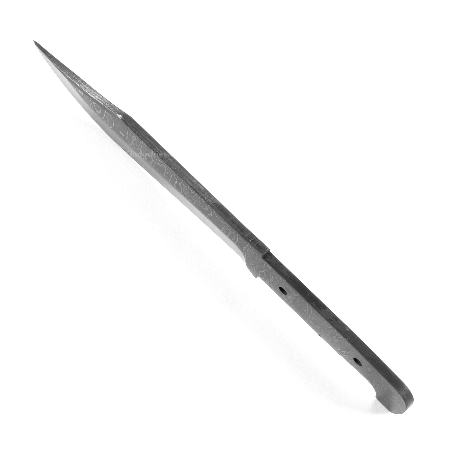This damascus clip point knife blank model is called the “Clipper XL”. It is a USA Made carbon steel damascus fixed blade knife blank that is hollow-ground and ready to build. This damascus trailing point knife kit model has a spry size and will make a fantastic personal carry knife. The Clipper XL knife kit has a blade length of 4.93 inches and an overall length of 8.87 inches, which is slightly larger than our standard Clipper knife model. Ground on both sides, the blade is 1.125 inches wide. This damascus knife blank design features (2) 0.156 inch through-holes for handle construction (stainless steel pinstock included). The tang holes can be modified with ease to work with larger pinstock, or with threaded fasteners. Please see our drills and taps sections for more options.