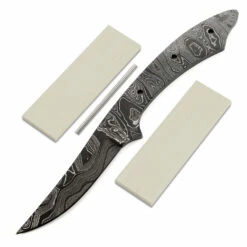 This modified damascus persian blade blank design is called the “Cuda”. It is a USA Made carbon steel damascus fixed blade knife blank that is hollow-ground and ready to build. This damascus persian knife kit model will make a fantastic personal carry utility knife. The straight-forward simplicity of the design also makes this damascus blade blank a great pick as a collectible gift project. With a blade length of 3.125 inches and an overall length of 7.95 inches, this modified persian knife kit design even works well as aconceal-carry personal knife. Ground on both sides, the Cuda’s blade is 0.75 inches wide with a 0.150 inch thickness. This damascus knife blank design features (3) 0.125 inch through-holes for handle construction (stainless steel pinstock included). The holes on the knife kit can be easily modified to work with larger pinstock or threaded fasteners.