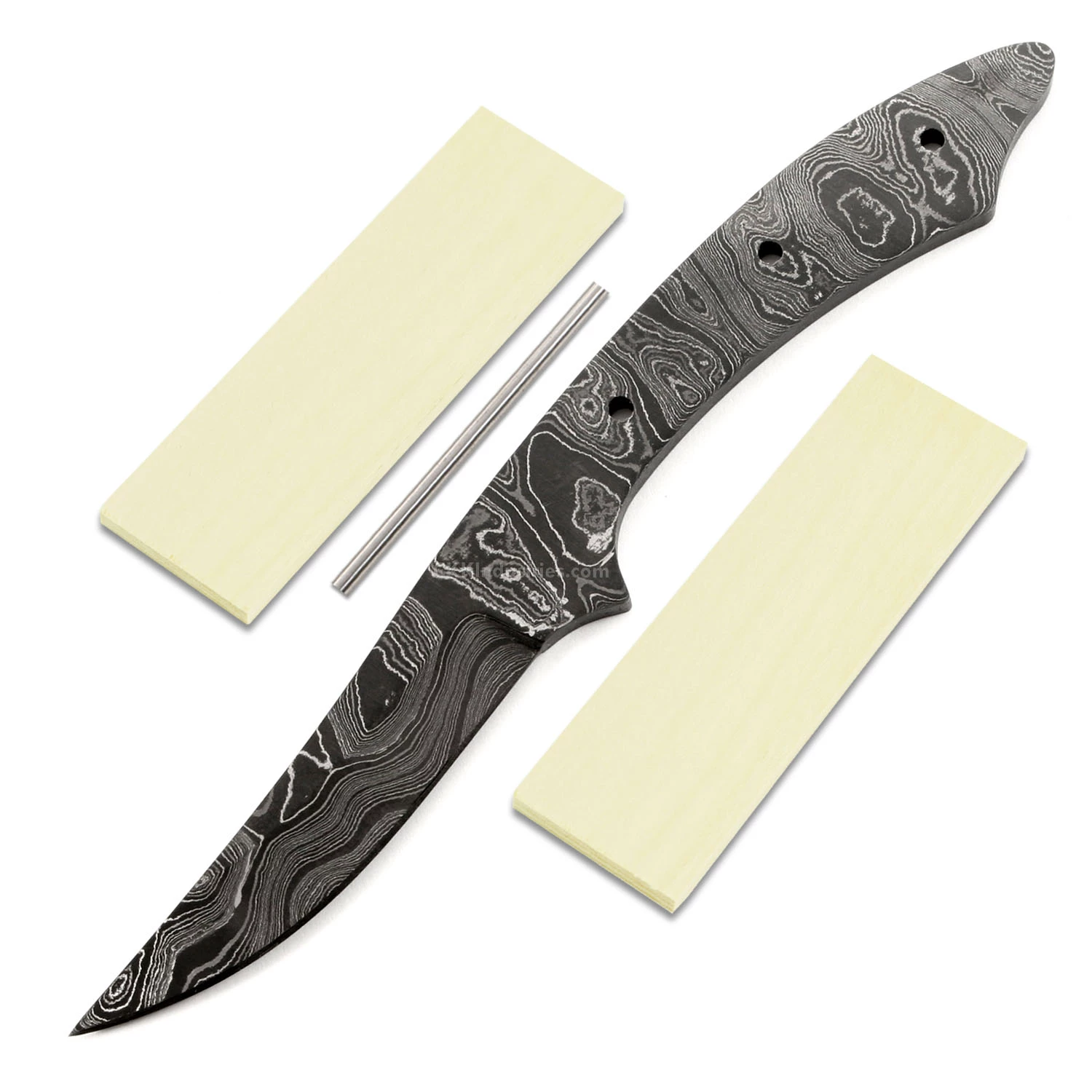 This modified damascus persian blade blank design is called the “Cuda”. It is a USA Made carbon steel damascus fixed blade knife blank that is hollow-ground and ready to build. This damascus persian knife kit model will make a fantastic personal carry utility knife. The straight-forward simplicity of the design also makes this damascus blade blank a great pick as a collectible gift project. With a blade length of 3.125 inches and an overall length of 7.95 inches, this modified persian knife kit design even works well as aconceal-carry personal knife. Ground on both sides, the Cuda’s blade is 0.75 inches wide with a 0.150 inch thickness. This damascus knife blank design features (3) 0.125 inch through-holes for handle construction (stainless steel pinstock included). The holes on the knife kit can be easily modified to work with larger pinstock or threaded fasteners.