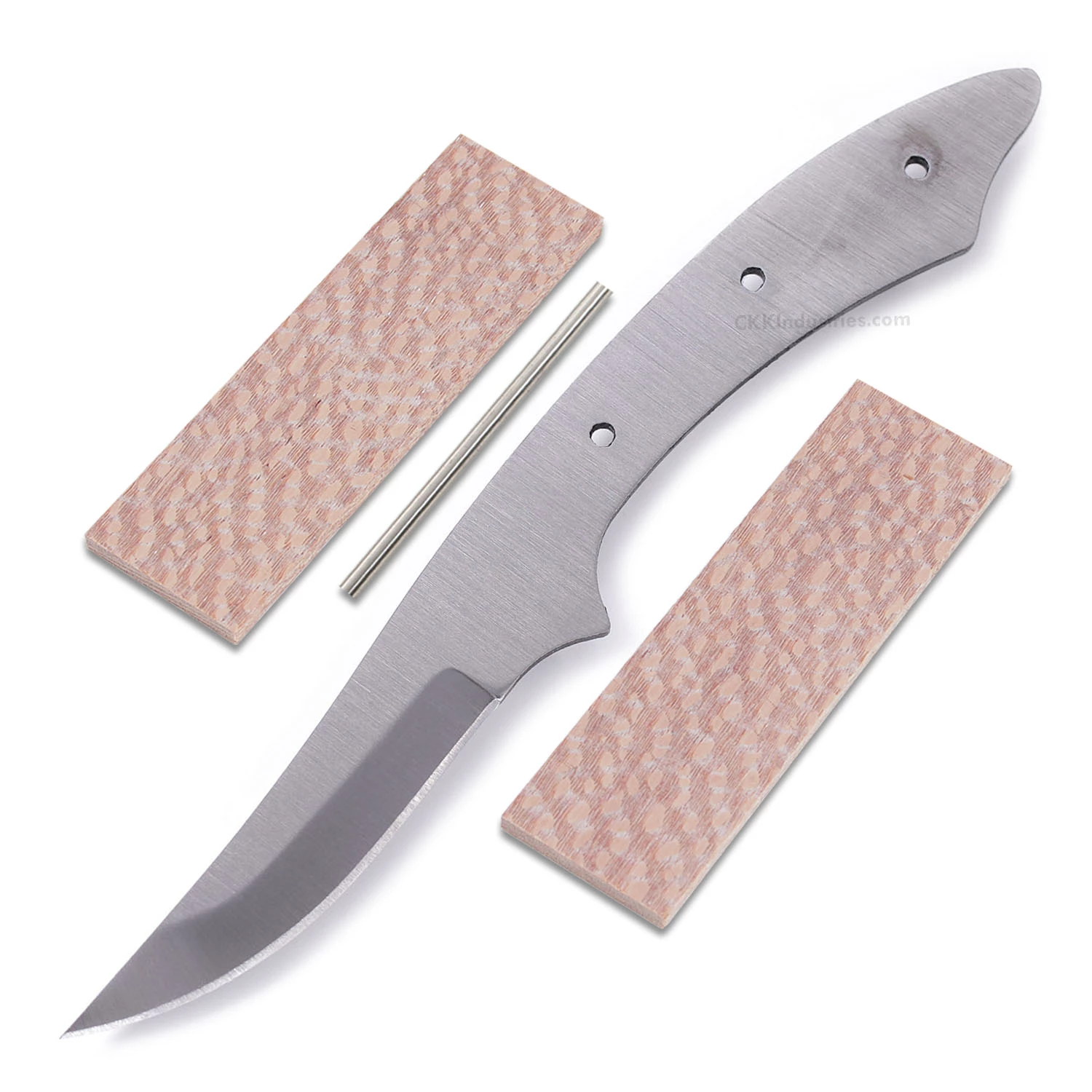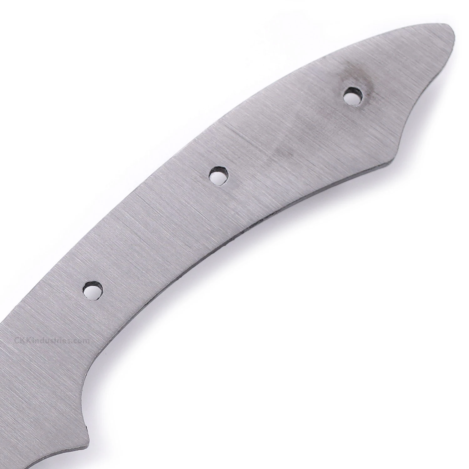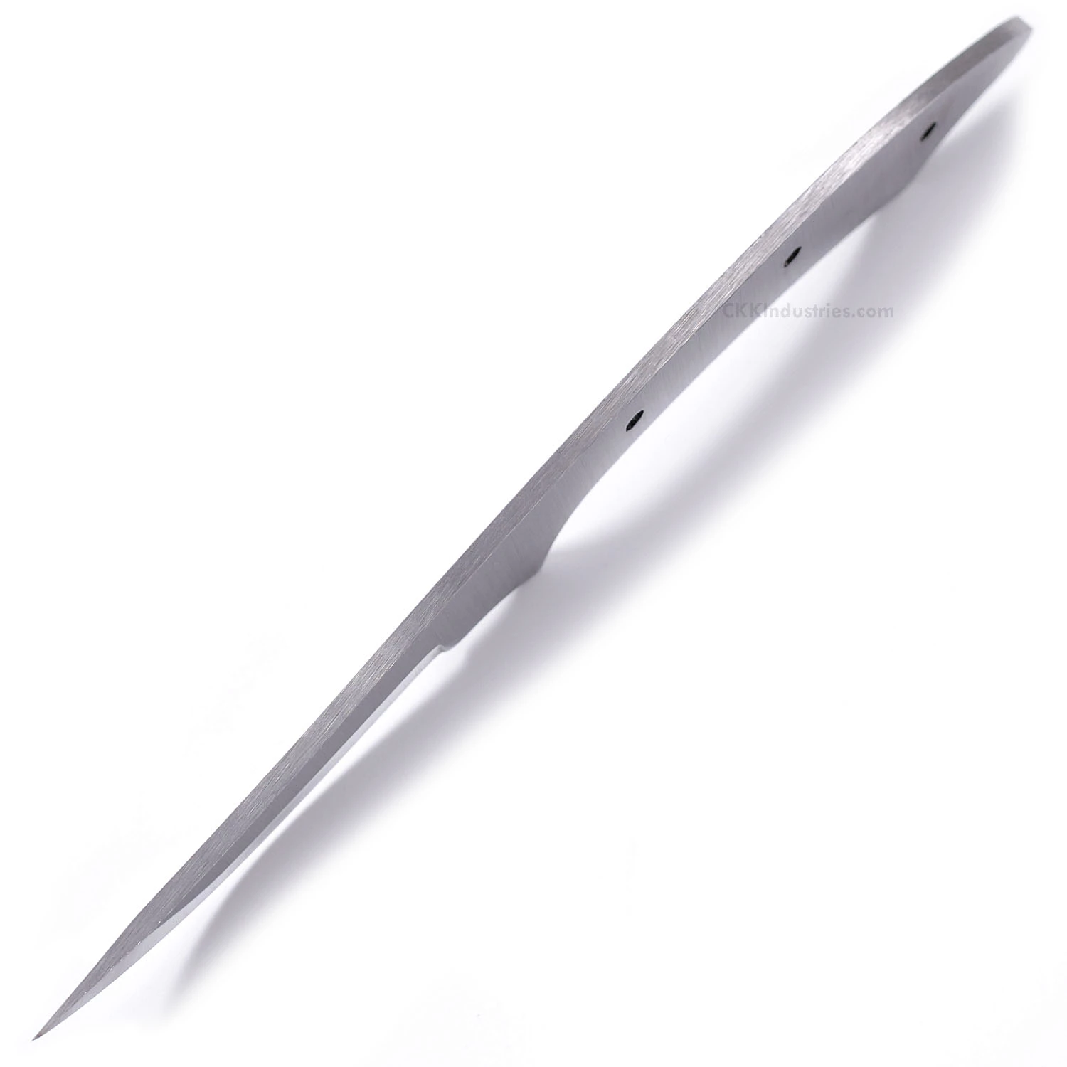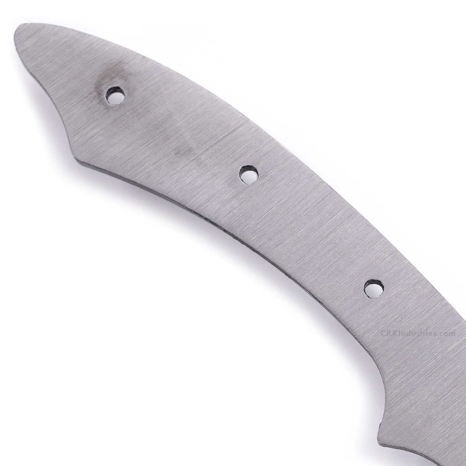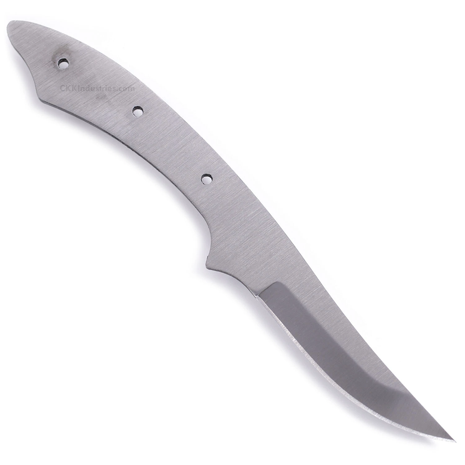 This modified high carbon persian blade blank design is called the “Cuda XL”. It is a USA Made carbon steel high carbon fixed blade knife blank that is hollow-ground and ready to build. This high carbon persian knife kit model will make a fantastic personal carry utility knife. The straight-forward simplicity of the design also makes this high carbon blade blank a great pick as a collectible gift project. With a blade length of 3.62 inches and an overall length of 7.93 inches, this modified persian knife kit design even works well as a conceal-carry personal knife. Ground on both sides, the Cuda’s blade is 0.75 inches wide with a 0.150 inch thickness. This high carbon knife blank design features (3) 0.125 inch through-holes for handle construction (stainless steel pinstock included). The holes on the knife kit can be easily modified to work with larger pinstock or threaded fasteners.