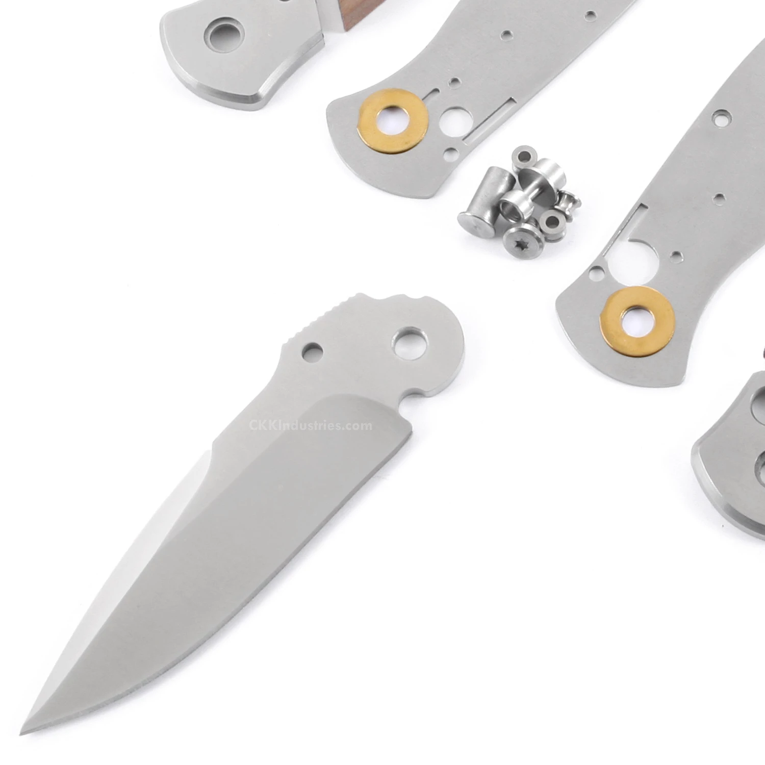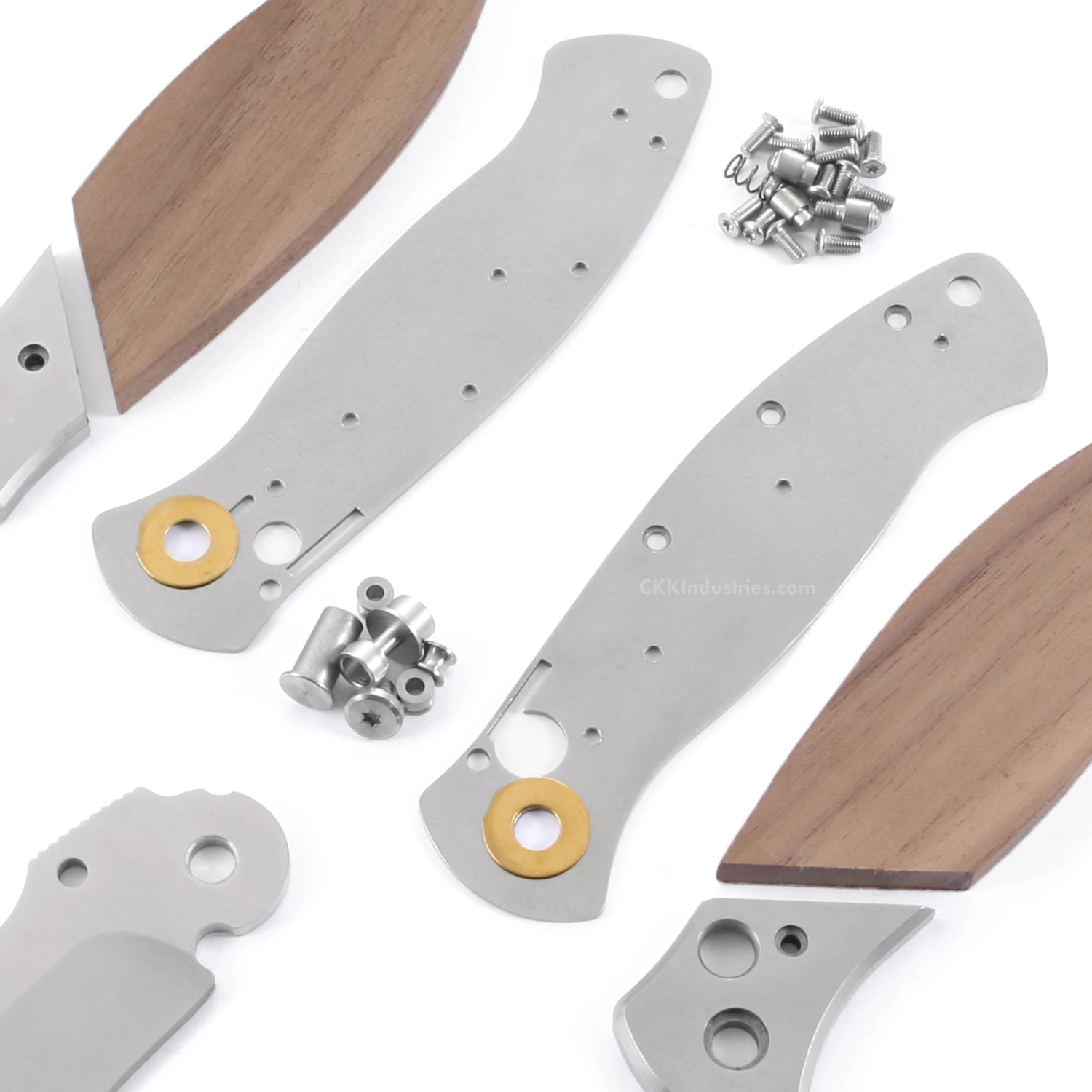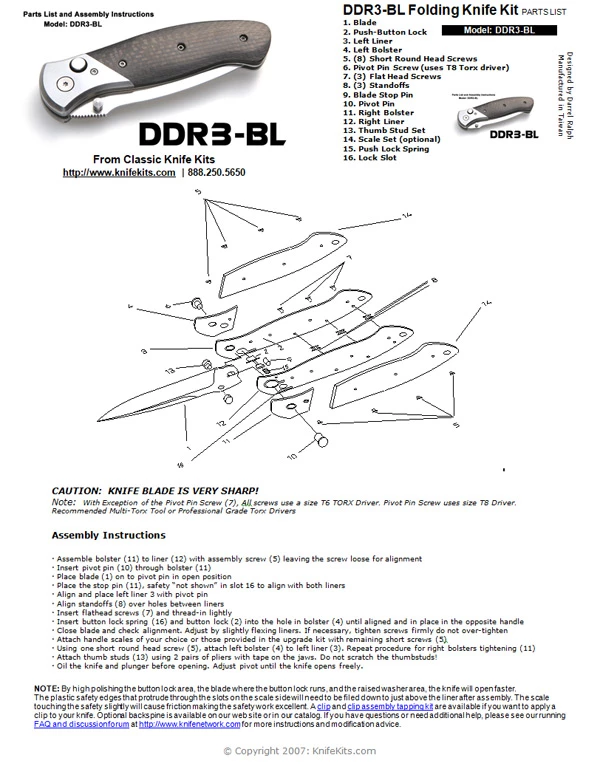 The DDR3BL series button lock knife kit offers the advanced kit builder more options in artistic design modification and mechanical performance than any other folding knife kit on the market. Designed to be the finest quality folding knife kit available, and with the added functionality and versatility of the button lock opening system, one will be hard pressed to find a better knife for the money, and one more fun to build and operate.This version is the combo kit. It comes with all of the DDR3-BL basic kit parts, plus pre-machined Walnut knife handle scales to simplify the completion process. Add a touch of proper finishing and create a fabulous folding knife that you’ll be proud to own and carry.