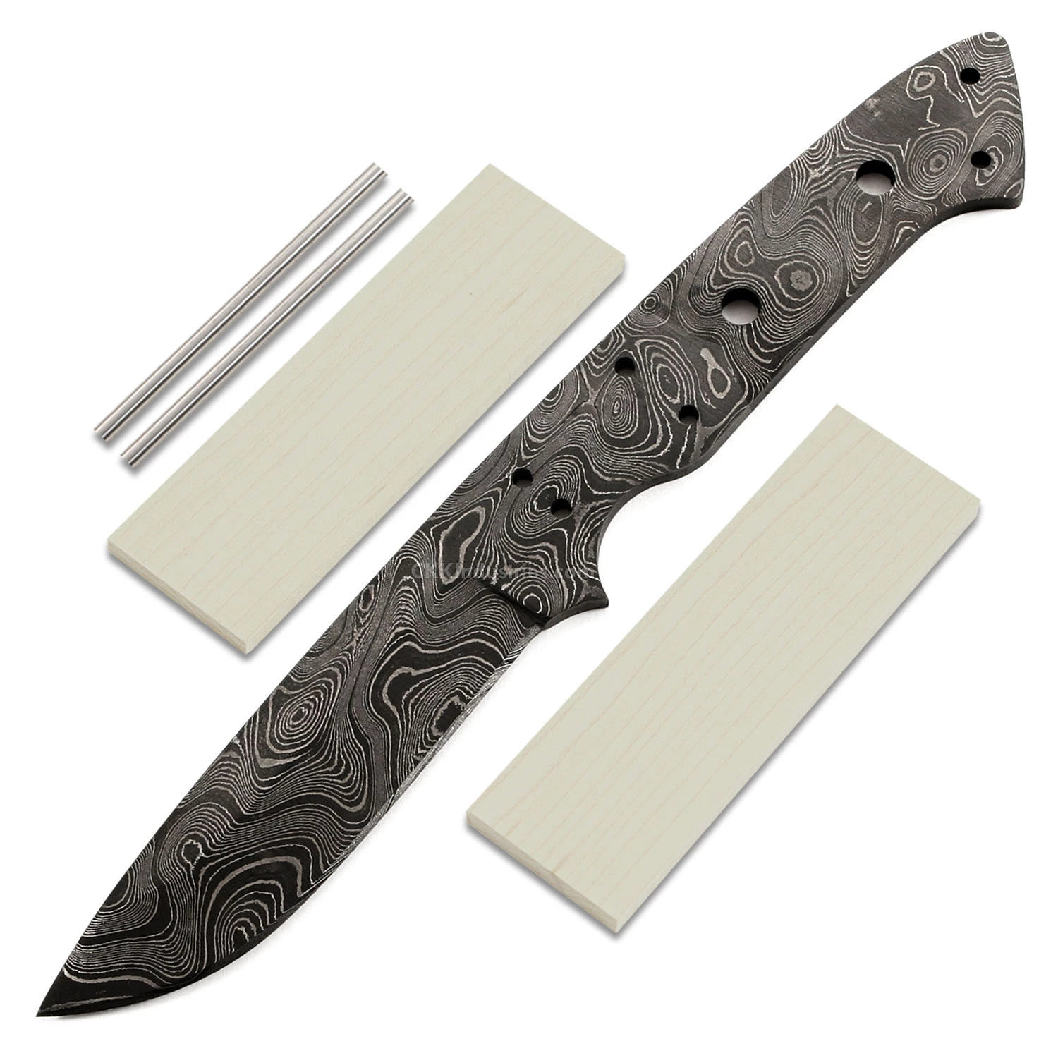 This damascus drop point knife model is called the “Desert Rose”. It is a USA Made carbon steel damascus fixed blade knife blank that is hollow-ground and ready to build. This damascus model will make a fantastic personal hunting or skinning knife. The flow of the design is excellent, creating a great feel in the hand. With a blade length of 3.50 inches and an overall length of 8.75 inches, this design is a perfect carry size. Ground on both sides, the Desert Rose’s blade is 1.00 inches wide. This damascus design features (6) 0.125 inches and (2) 0.250 inch through-holes for handle construction (stainless steel pinstock inlcluded). The tang holes can be modified with ease to work with larger pinstock, or with threaded fasteners.