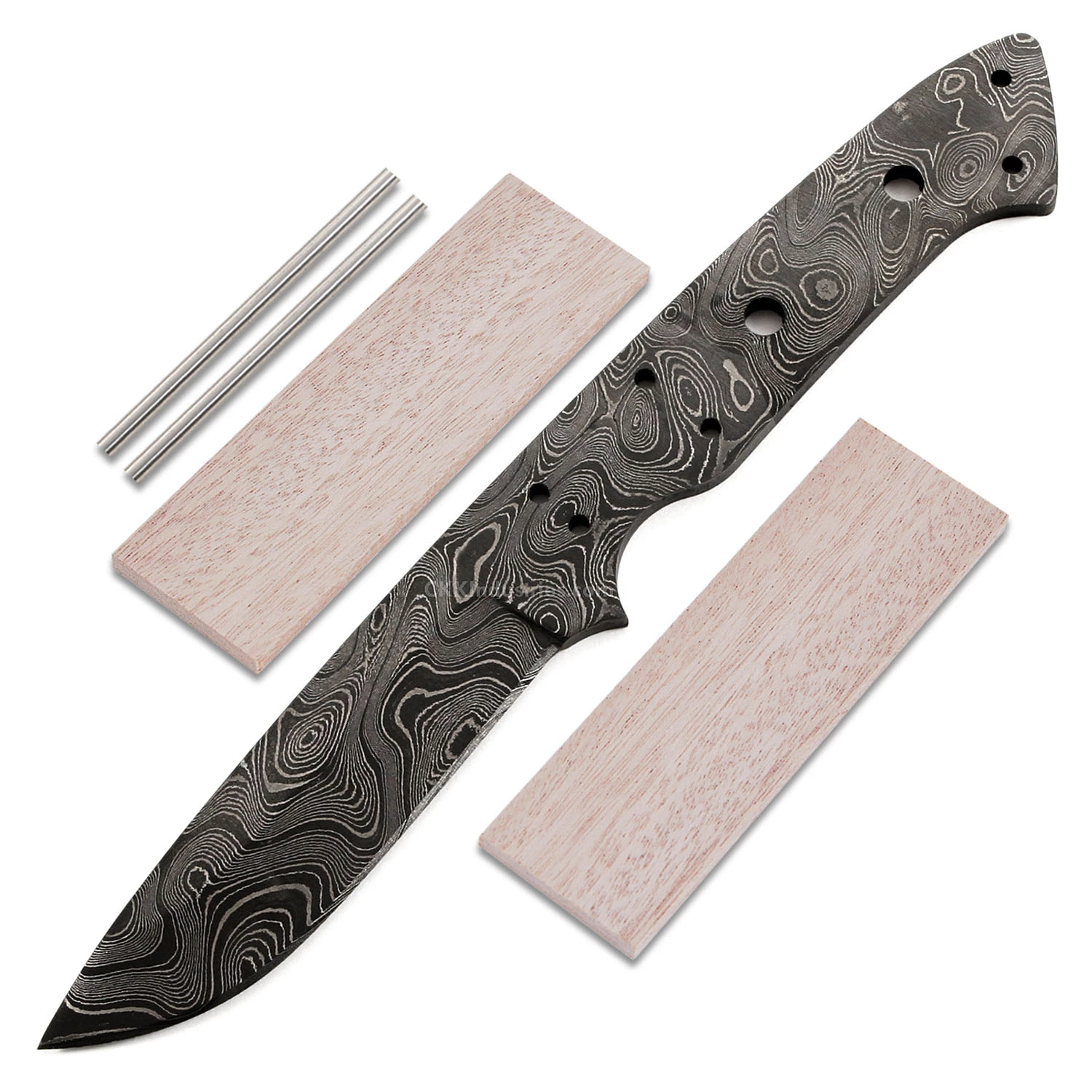 This damascus drop point knife model is called the “Desert Rose”. It is a USA Made carbon steel damascus fixed blade knife blank that is hollow-ground and ready to build. This damascus model will make a fantastic personal hunting or skinning knife. The flow of the design is excellent, creating a great feel in the hand. With a blade length of 3.50 inches and an overall length of 8.75 inches, this design is a perfect carry size. Ground on both sides, the Desert Rose’s blade is 1.00 inches wide. This damascus design features (6) 0.125 inches and (2) 0.250 inch through-holes for handle construction (stainless steel pinstock inlcluded). The tang holes can be modified with ease to work with larger pinstock, or with threaded fasteners.