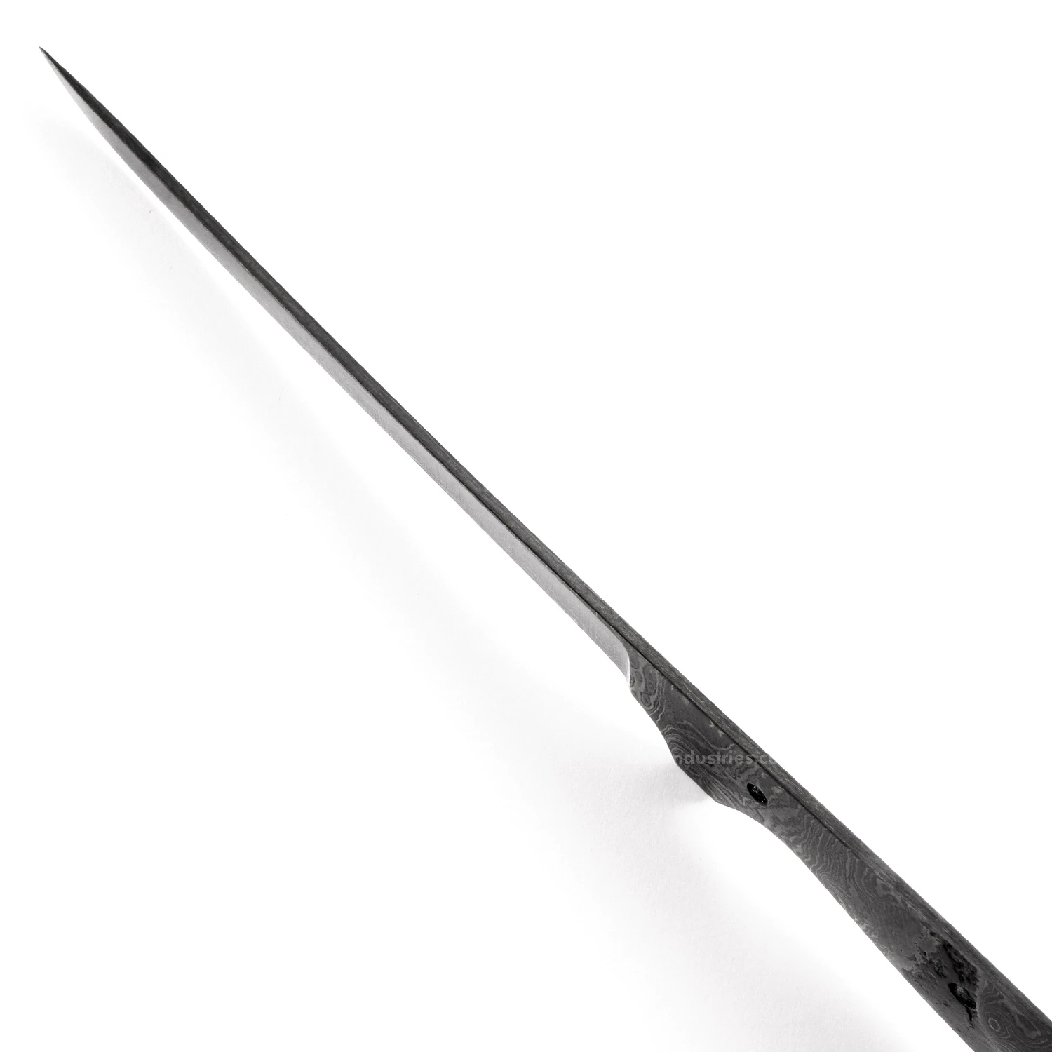 This striking damascus filet blade blank design is called the “Dress Filet”. It is a USA Made carbon steel damascus fixed blade knife blank that is hollow-ground and ready to build. This damascus filet knife kit model will make a fantastic up-scale filet knife, suitable for any well-dressed cook. Or, give one to a friend who likes to cook as a collectible gift project. With a blade length of 6.125 inches and an overall length of 11.50 inches, the Dress Filet can handle any job. Ground on both sides, the blade is 0.50 inches wide with a 0.10 inch thickness. This damascus filet blade blank design features (2) 0.156 inch through-holes (stainless steel pinstock included), and (1) 0.187 inch hole for handle construction. The tang holes on this model can be modified with ease to work with larger pinstock, or with threaded fasteners.