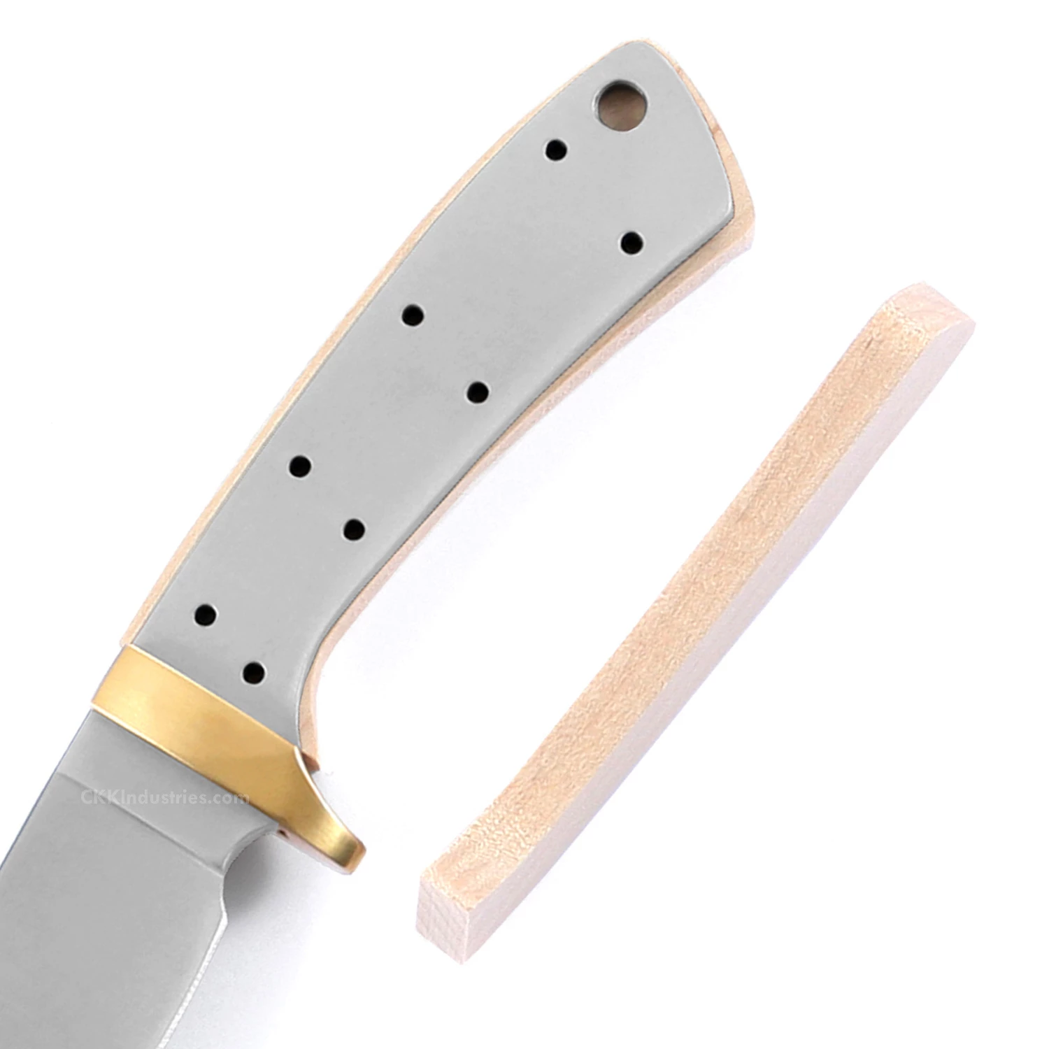 This version is the Drop Point Cub combo kit. It comes with the Drop Point Cub blade plus (2) pre-machined Curly Maple wood handle scale blanks to simplify the completion process. Our pre-machined knife handle scales are slightly thicker and larger in diameter than the handle tang they are designed for. This allows for proper sanding, shaping, and artistic embellishment. They are also undrilled to allow precise placement control and to maximize fastening options.