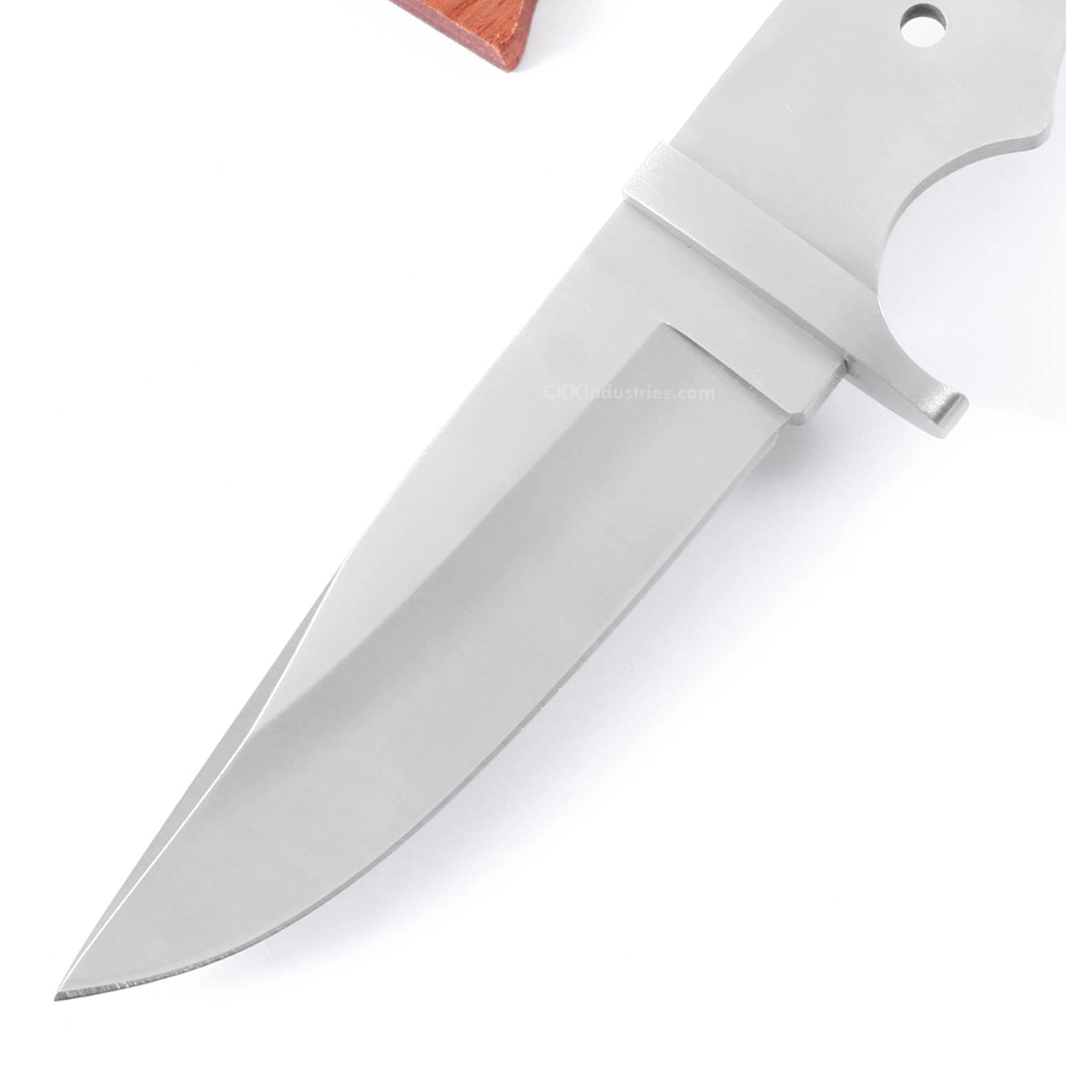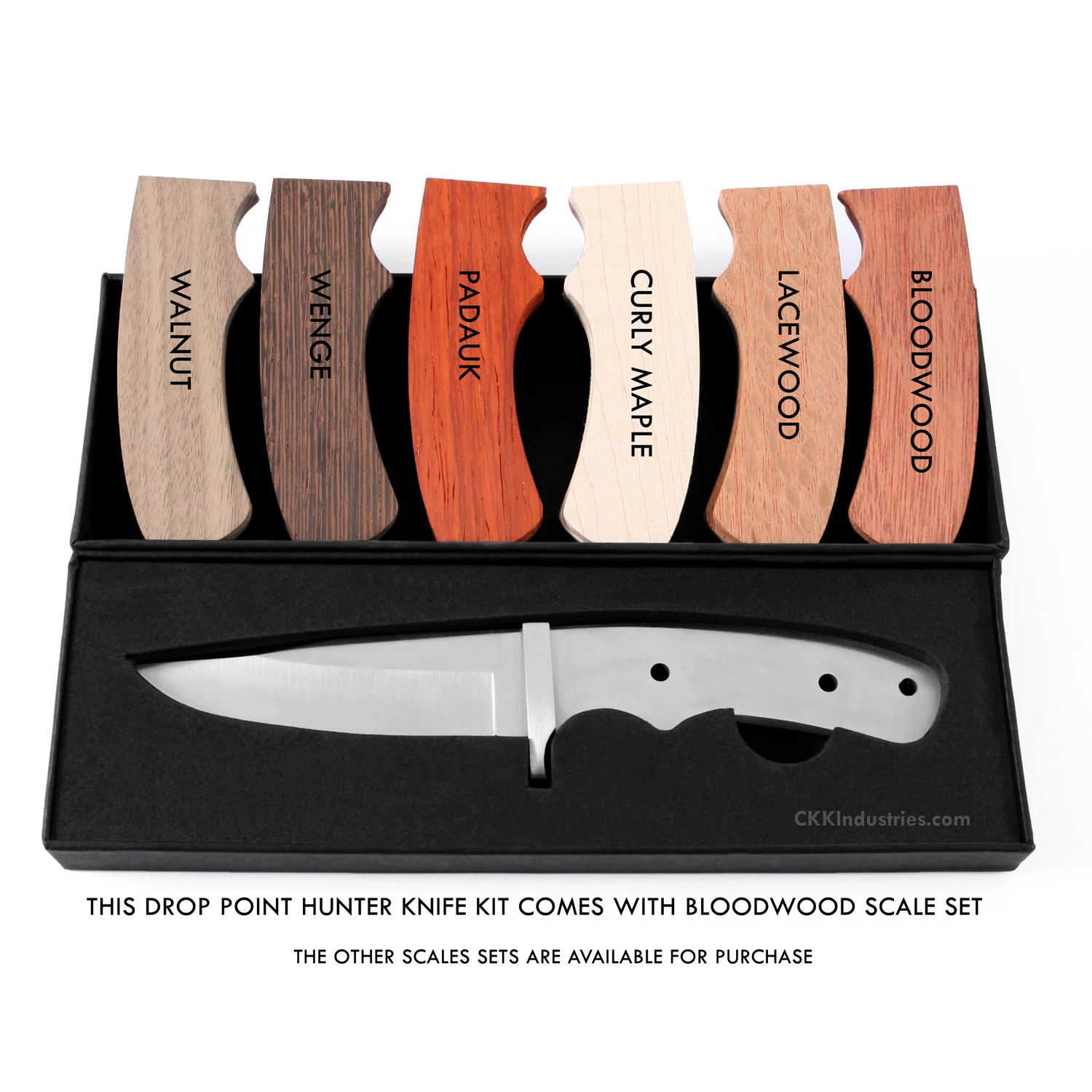 This version of the Drop Point Hunter is the combo kit with pre-machined handle scales. It comes with the Drop Point Hunter blade plus pre-machined Bloodwood handle scales, stainless steel pinstock, and a thong hole tube to simplify the completion process. This is a great project for a weekend knife making session. Spend some quality workshop time with this knife kit and enjoy the fun of custom knife making and customization.