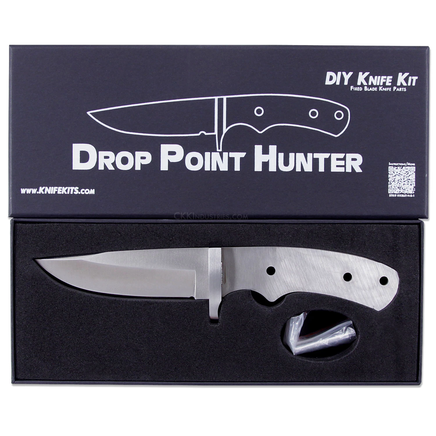 The Drop Point Hunter is a great full tang hunting knife blank design. The blade is made from 440A stainless steel. The blade length on this model is 4.00 inches and the thickness is 0.185 inches. It comes hollow ground, satin finished and has a pre-pinned 420 stainless steel finger guard attached. This is a great hunting knife blade blank and is a fun, affordable and simple project to complete. The tang has (2) pre-drilled 0.187 inch through-holes for handle attachment (stainless steel pinstock included) as well as a 0.187 inch thong hole for optional lanyard treatment (thong hole tube included).
