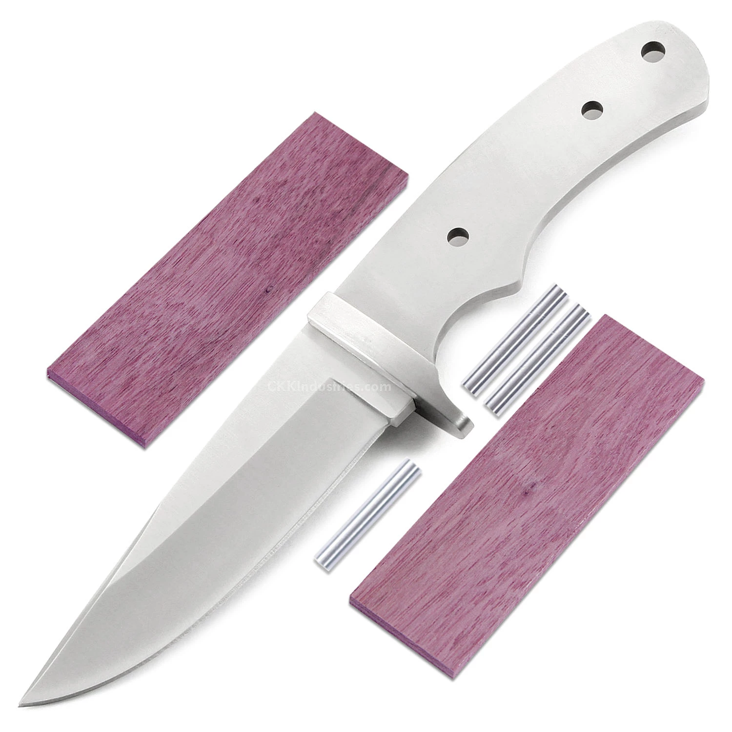 This version of the Drop Point Hunter is the combo kit. It comes with the Drop Point Hunter blade plus Purpleheart handle scales, stainless steel pinstock, and a thong hole tube to simplify the completion process. This is a great project for a weekend knife making session. Spend some quality workshop time with this knife kit and enjoy the fun of custom knife making and customization.