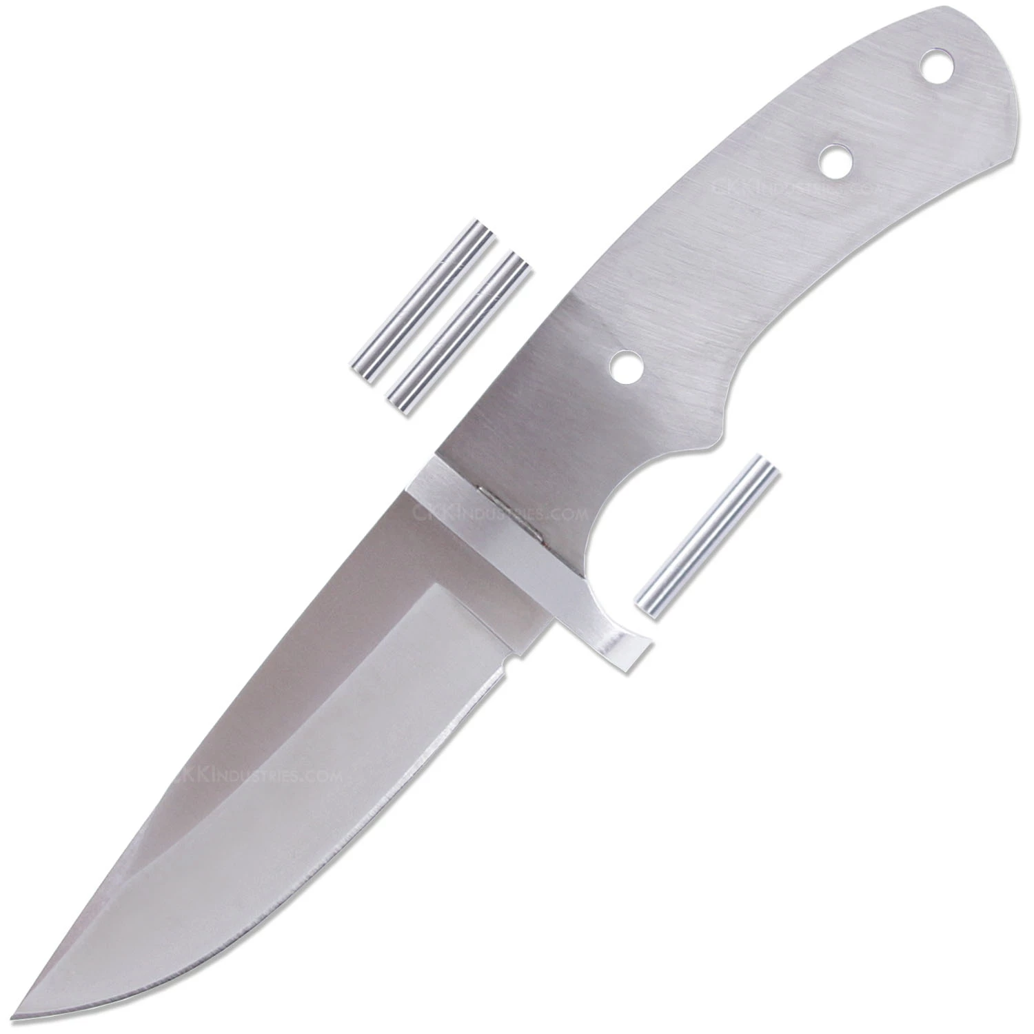 This is a great hunting knife blade blank and is a fun, affordable and simple project to complete. The tang has (2) pre-drilled 0.187 inch through-holes for handle attachment (stainless steel pinstock included) as well as a 0.187 inch thong hole for optional lanyard treatment (thong tube included).
