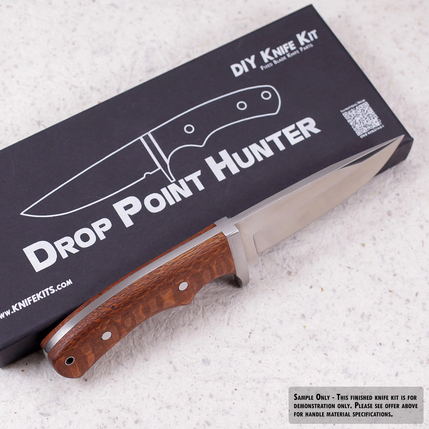 The Drop Point Hunter is a great full tang hunting knife design. The blade is made from 440C stainless steel. The blade length on this model is 4.00 inches and the thickness is 0.185 inches. It comes hollow ground, satin finished and has a pre-pinned 420 stainless steel finger guard attached (engravable).