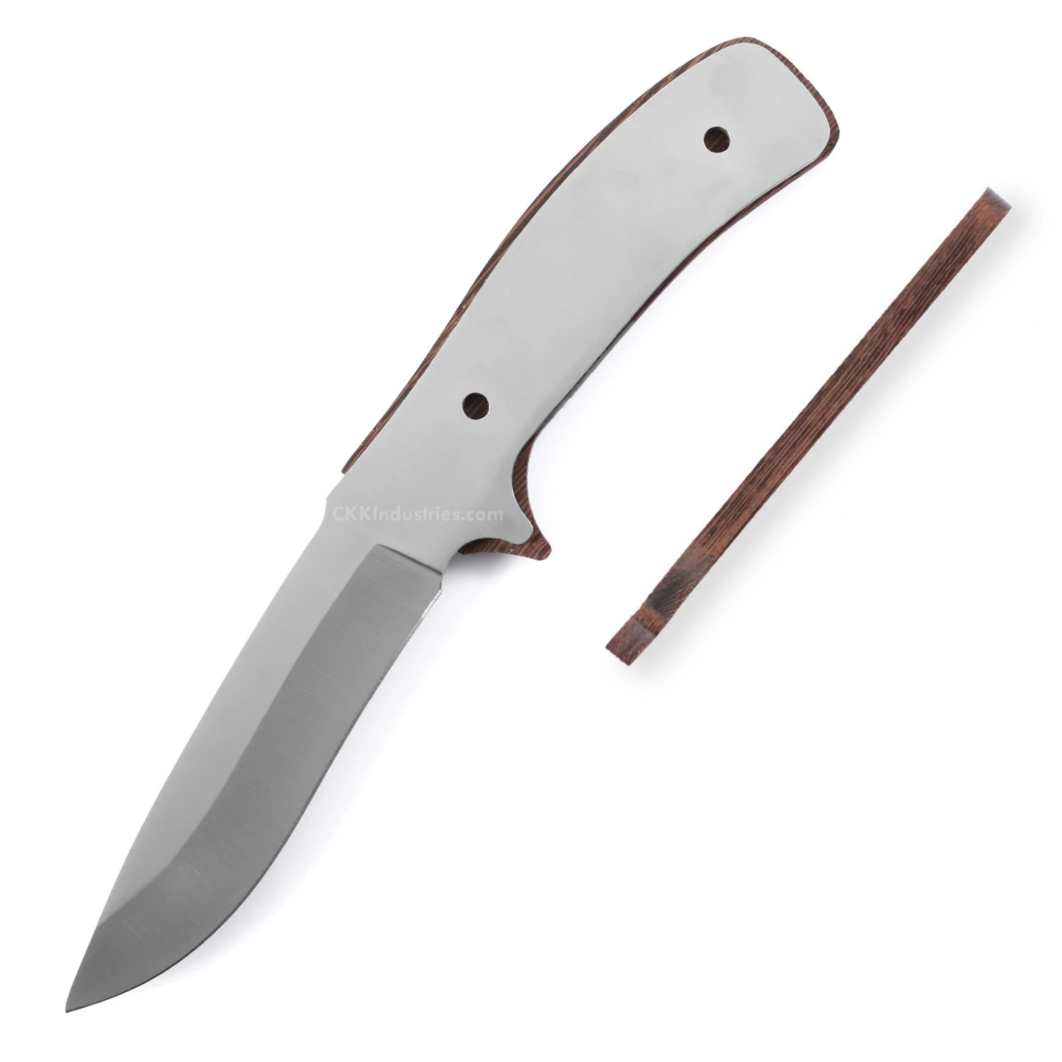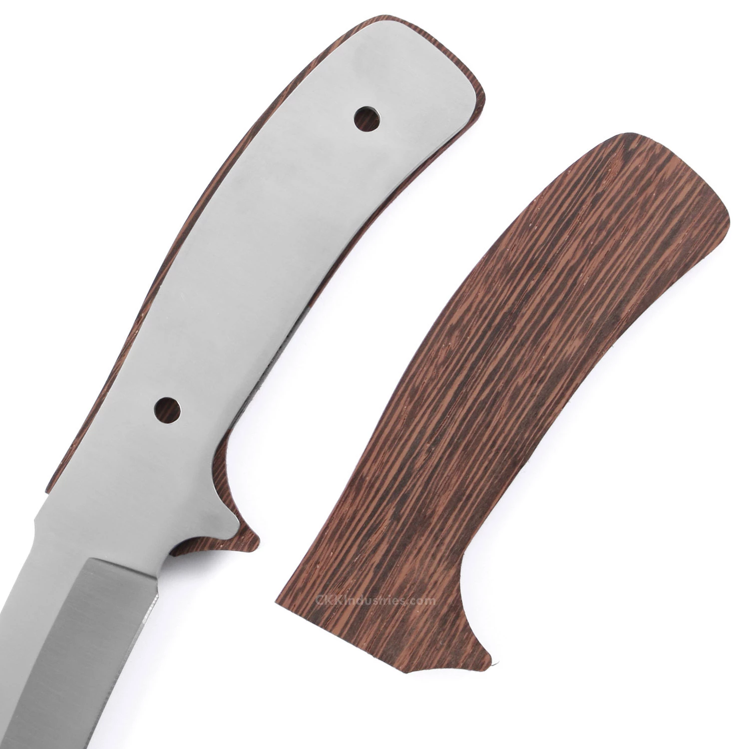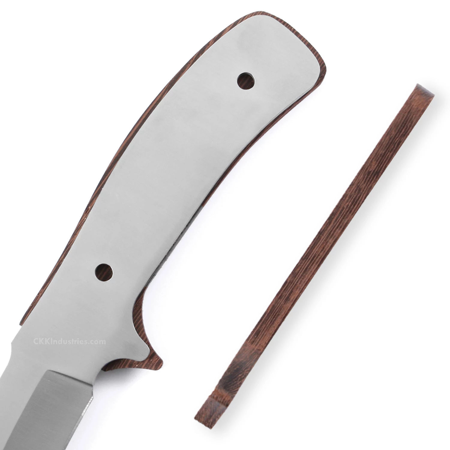 The Drop Point Tactical knife kit is a 9.5 inch utility/tactical bolsterless design. You can do a full handle, a partial or even an overlay with palm swells. This drop point knife blank has a slight recurve shape with a satin-finished, deep hollow grind. It has a thumbrest on the top spine to give your thumb extra leverage over your cutting work. The blade thickness is .155 inches and feels well balanced. The tang is 1.1 inches wide, and is excellent for larger hands. The Drop Point Tactical blade blank is made from AUS8 stainless steel. This version is the combo kit. It comes with the Drop Point Tactical blade plus pre-machined Wenge handle scales to simplify the completion process. Add a touch of proper finishing and create a fabulous custom knife that you’ll be proud to own and use.