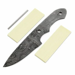 This damascus drop point blade blank is called the “Duster”. It is a USA Made carbon steel damascus fixed blade knife blank that is hollow-ground and ready to build. This damascus knife kit model offers a wide blade profile for versatile cutting chores. It also features an ergonomic handle that will help you shape a grip that maximizes retention. The Duster damascus knife kit makes a fantastic personal carry knife. With a blade length of 3.00 inches and an overall length of 7.125 inches, this design is excellent for a skinner or utility knife. Hollow ground on both sides, the Duster’s blade is 1.25 inches wide with a 0.140 inch thickness. This damascus drop point blade blank design features (2) 0.250 inch through-holes for handle construction (stainless steel pinstock included). The tang holes on this design can be modified with ease to work with larger pinstock, or with threaded fasteners.