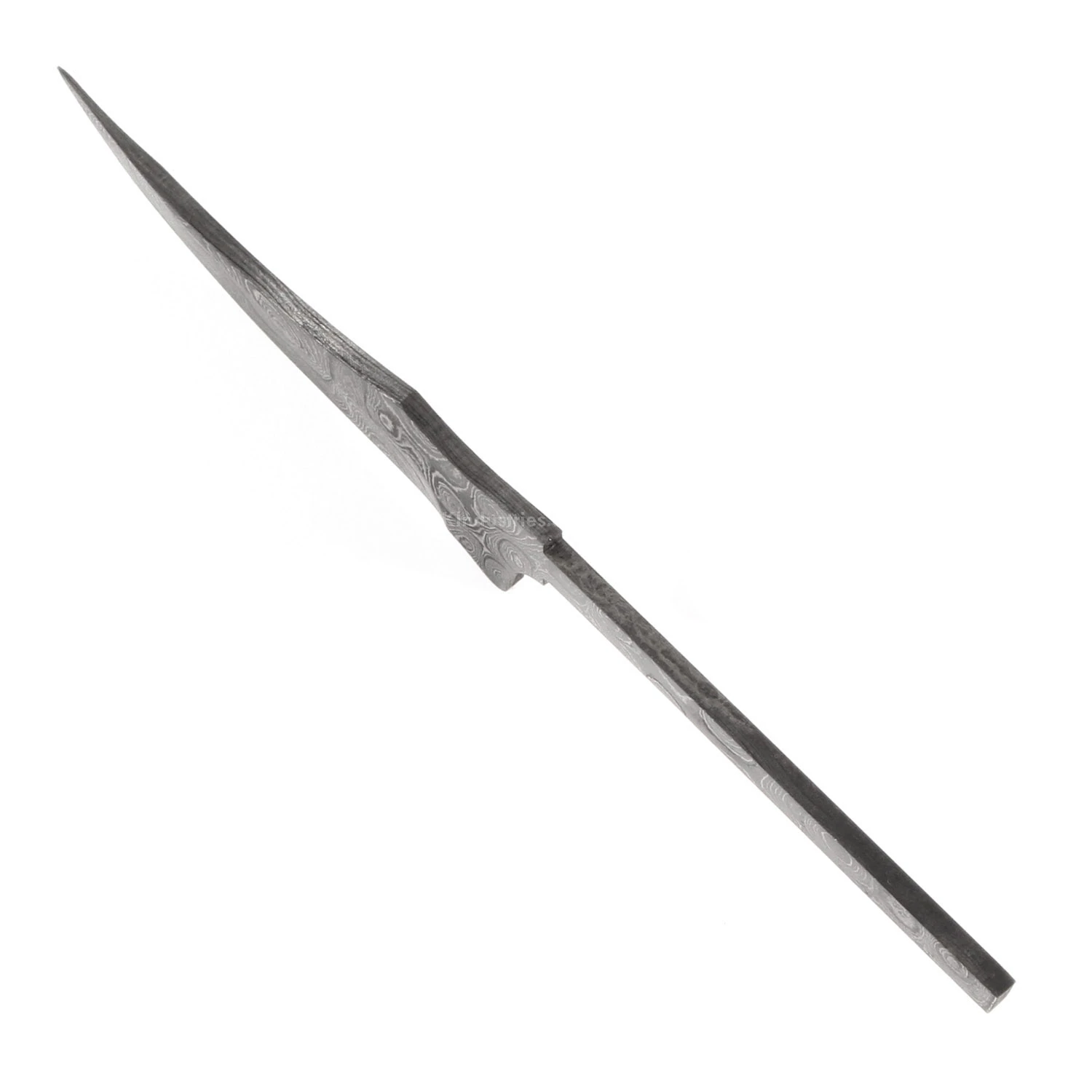 This hidden tang trailing point knife kit design is called the “Eastern Boot”. It is a USA Made carbon steel damascus fixed blade knife blank that is hollow-ground and ready to build. This hidden tang knife blank model will make a great hunting or skinning knife project for the DIY builder. It is expertly designed and well made.