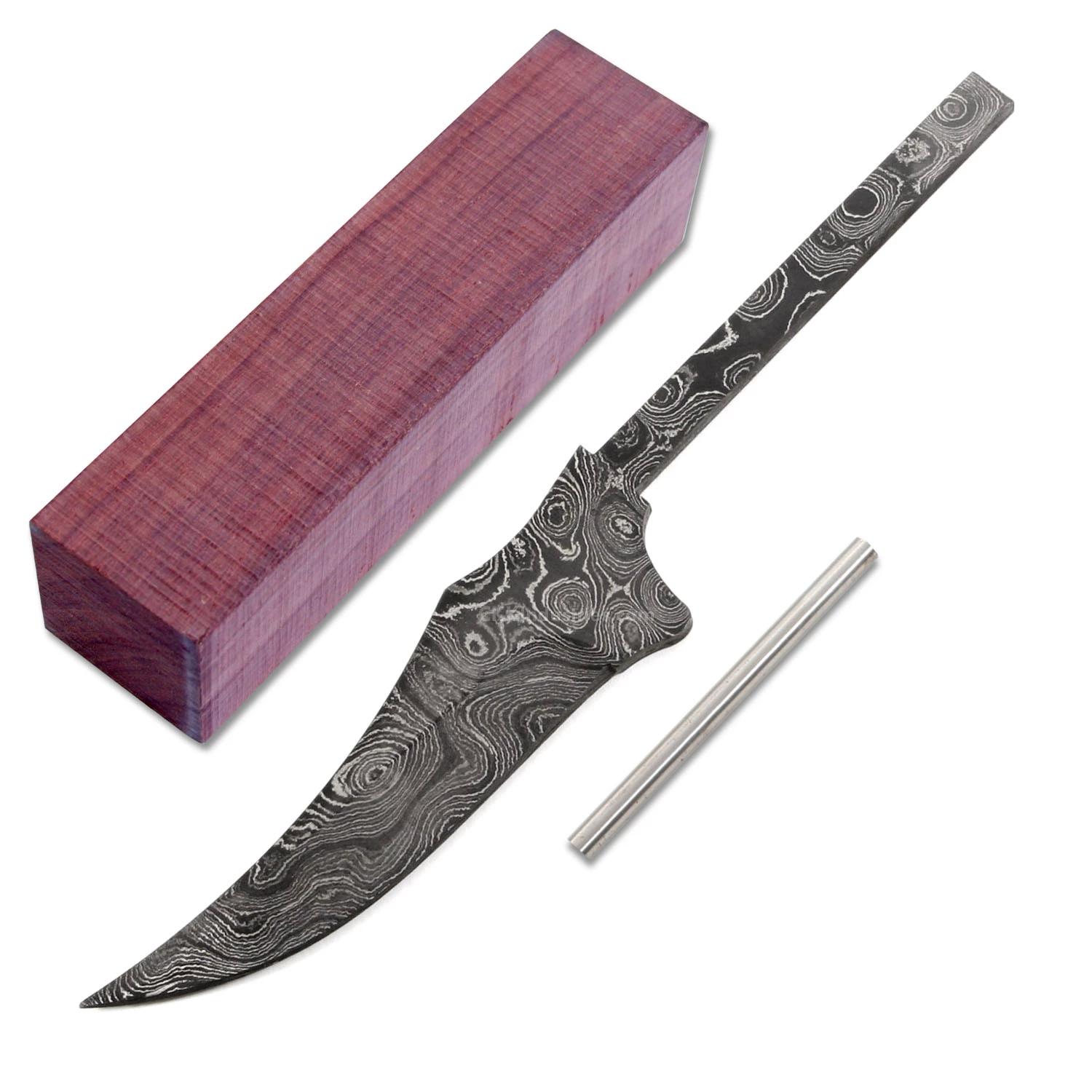 This hidden tang trailing point knife kit design is called the “Eastern Boot”. It is a USA Made carbon steel damascus fixed blade knife blank that is hollow-ground and ready to build. This hidden tang knife blank model will make a great hunting or skinning knife project for the DIY builder. It is expertly designed and well made.