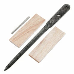 This damascus letter opening blade blank design is called the “Executive”. It is a USA Made carbon steel damascus fixed blade knife blank that is double-ground and ready to build. This model will make a great executive letter opener. The Executive also makes a great gift project for hobby builders. With a blade length of 5.0 inches and an overall length of 9.0 inches, this classic letter opener is perfect for the task. Ground on both sides, the Executive’s blade is 0.4375 inches wide with a 0.120 inch thickness. This damascus knife blank model features (2) 0.125 inches and (1) 0.250 inch through-holes for handle construction (stainless steel pinstock included). The tang holes can be easily modified to work with larger pinstock or threaded fasteners.
