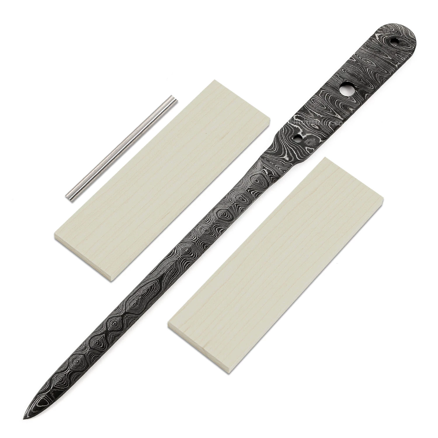 This damascus letter opening blade blank design is called the “Executive”. It is a USA Made carbon steel damascus fixed blade knife blank that is double-ground and ready to build. This model will make a great executive letter opener. The Executive also makes a great gift project for hobby builders. With a blade length of 5.0 inches and an overall length of 9.0 inches, this classic letter opener is perfect for the task. Ground on both sides, the Executive’s blade is 0.4375 inches wide with a 0.120 inch thickness. This damascus knife blank model features (2) 0.125 inches and (1) 0.250 inch through-holes for handle construction (stainless steel pinstock included). The tang holes can be easily modified to work with larger pinstock or threaded fasteners.